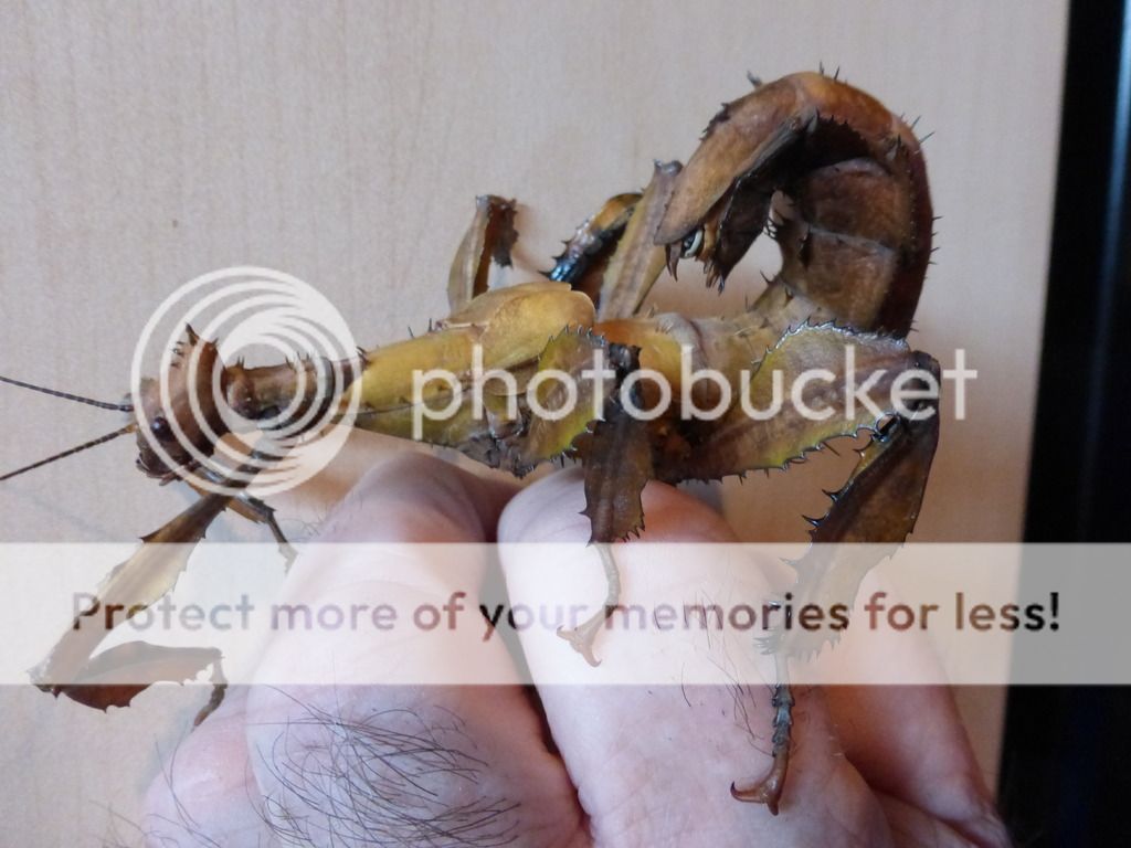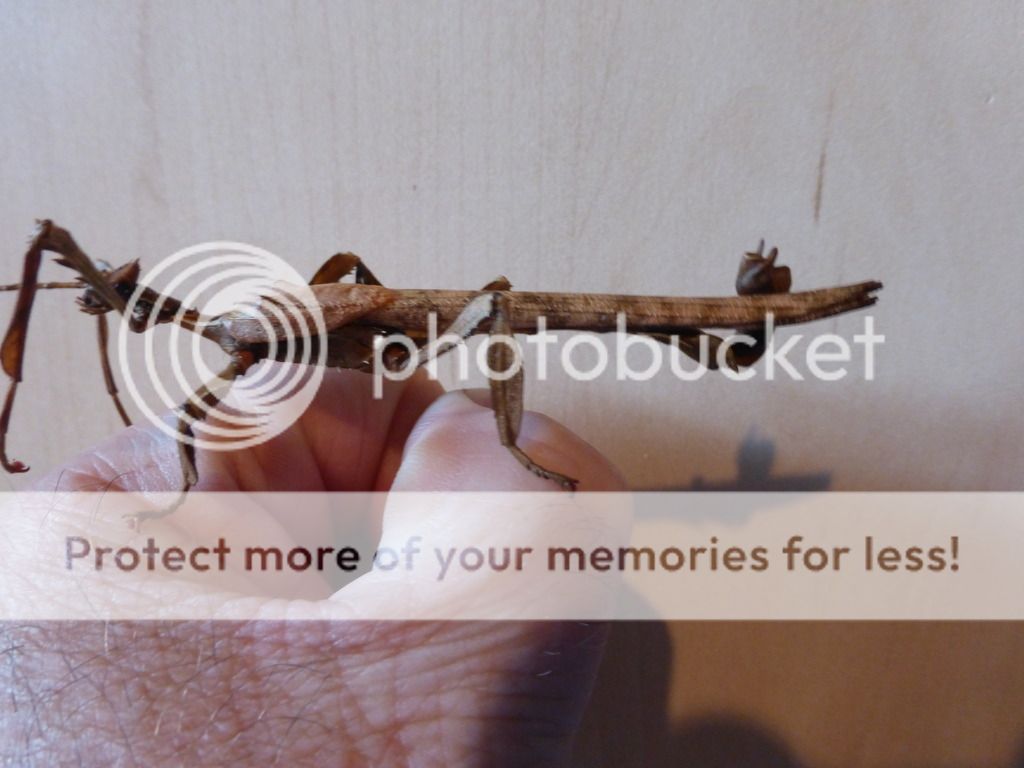 I have raised the Australian Stick Bug (Extatosoma tiaratum) for seven years now. The females are massive, and do not need a male to reproduce. In securing fresh stock I got some Australian ova from England, and in that stock received two males. Males are rare in the USA, and I have been fortunate enough to get two of them. First is a picture of the female: