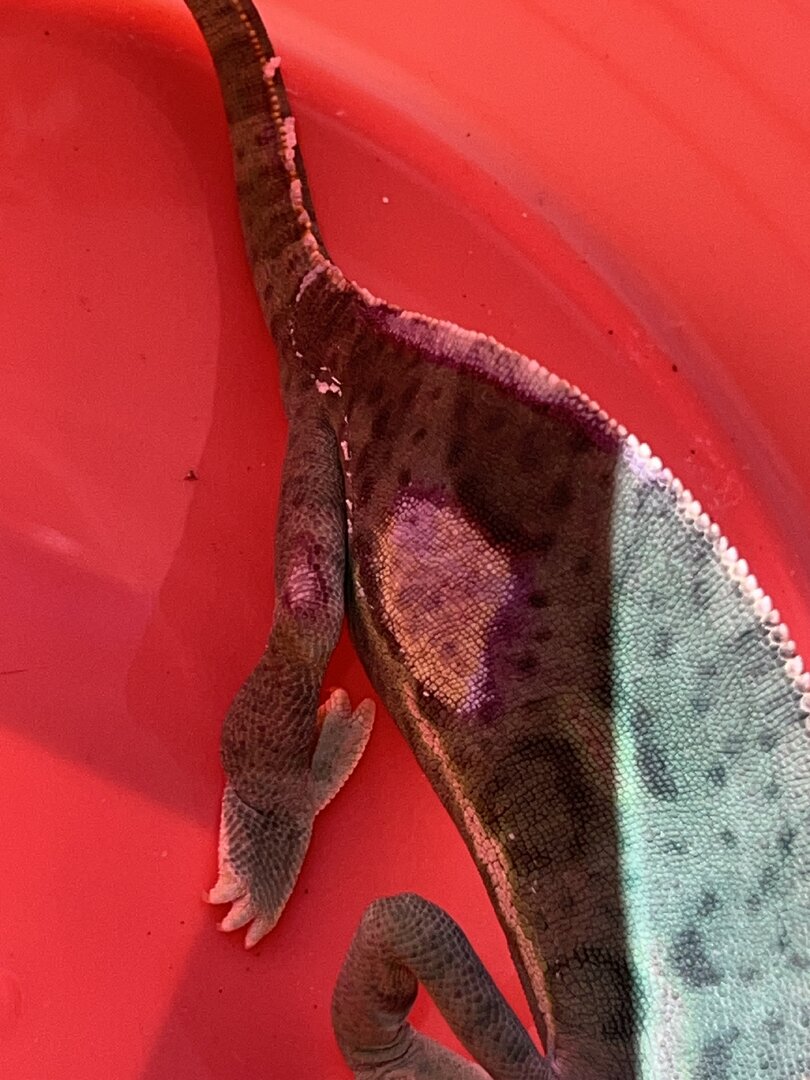 My veiled has this strange discolored spot on its side and kind of on its lower back. It also has some new purple like colors and I’m not sure if that’s normal. A reptile shop told me it was for sure a male but I’m not totally sure if they are right. Going to attach pictures of the spot. It does change so I’ll post a few. The purple is only along the back and around the weird spot.