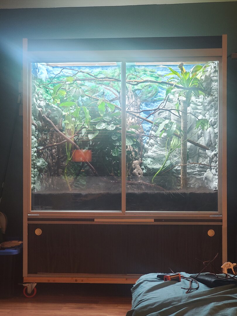 Wow! Looks great! Your guy is going to love having all of that space to patrol.It's in the house !!!!!!! So much bigger next to his current enclosure. Finishing touches are happening tonight then we let the plants fill in and slowly let him learn his new home!!!!!