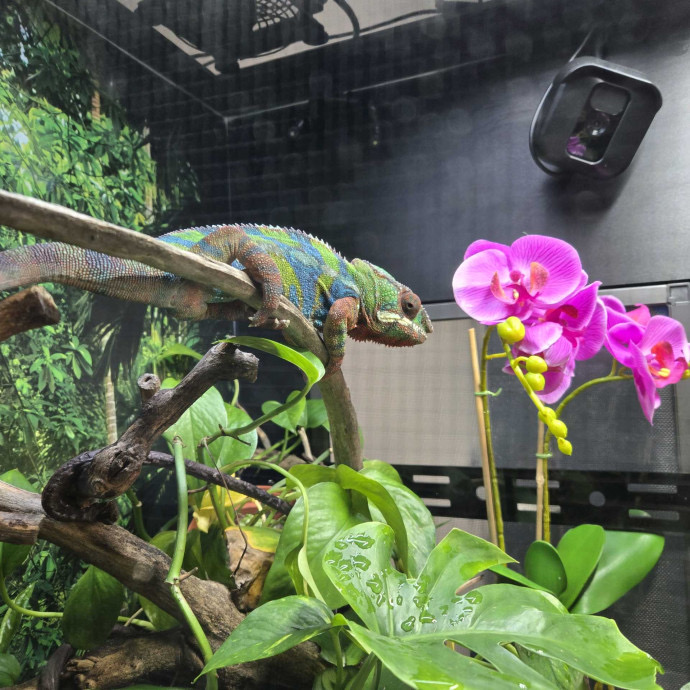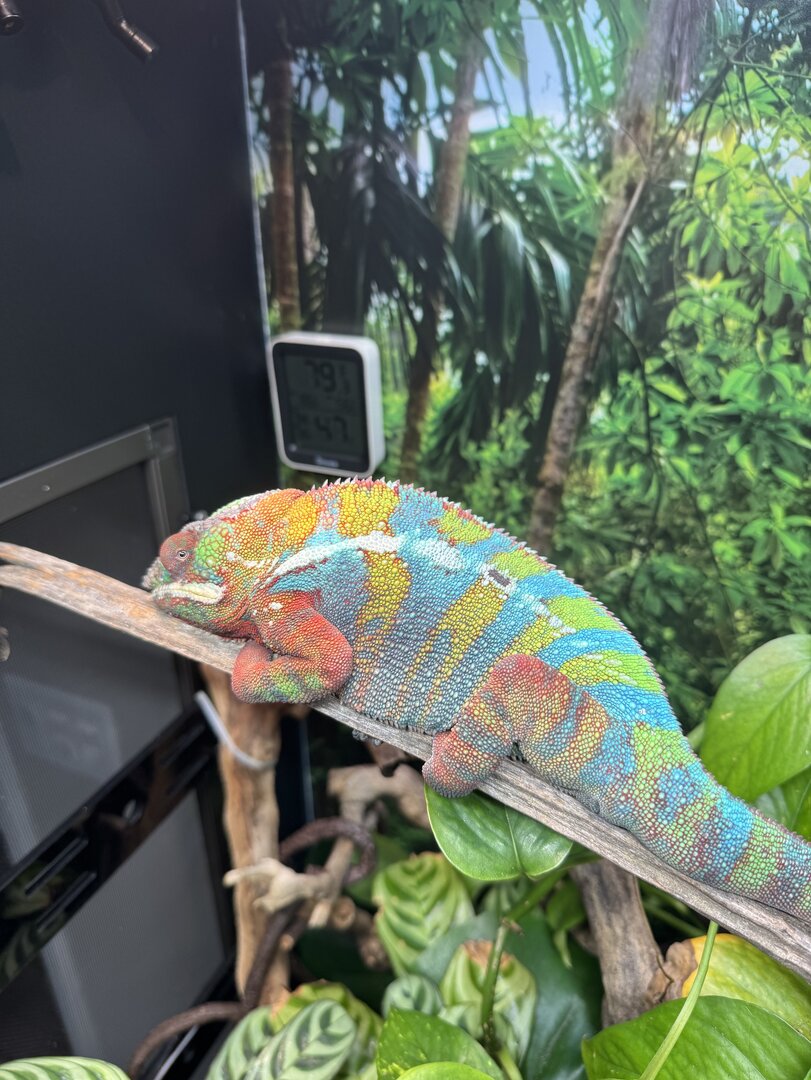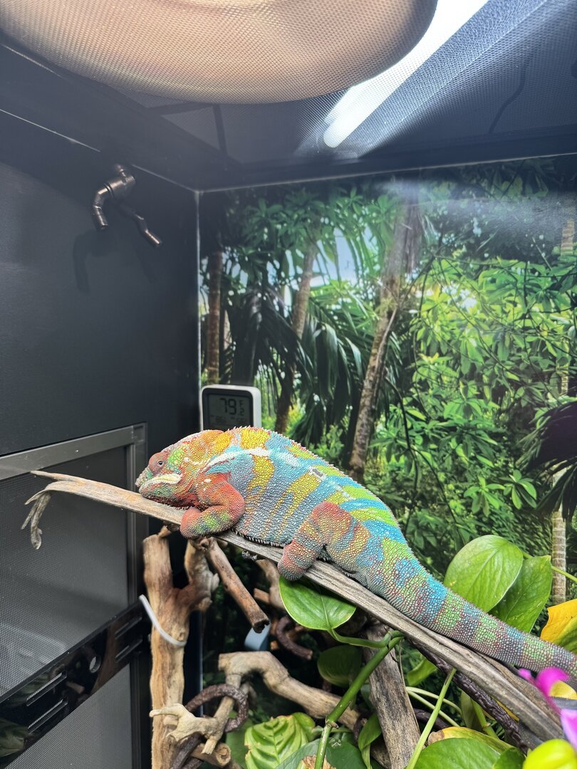 I’ve since replaced it with a 100W bulb and now the basking branch is 90 degrees or so and the chameleon’s body temp is 98-100+.