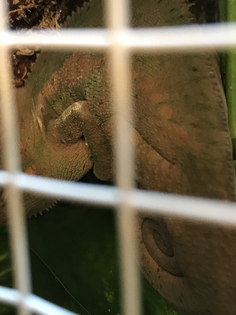 So what else could it be? And other then that, does he look healthy? I have provided a pic of his arm & what he looks like right before bed (he usually goes to his sleeping spot 2 hours before lights out...I have “never” caught him sleeping while lights on but he seems to like his sleeping spot a lot). I do put a black curtain (can not see through it) up at night since he is in the dining room (that room’s lights are always off at night for him but since our living room is close by, I just add the curtain so it’s as dark as possible. I even put the curtain up in full darkness so it doesn’t scare him as I’m putting it up. Also I have provided a pic of his enclosure & of him in full color. He doesn’t seem to use his bright colors often though...usually he is just a greenish brown. Is that normal? He does seem like a very calm guy. I don’t handle him often (actually just 3 times total!) but I will put 2 fingers close to his hands, in hopes he will climb onto my hand one day...it’s a very slow process. I do this maybe once a week for maybe 30 seconds. I have provided all other husbandry info below. Any thoughts would be greatly appreciated on him & how I can improve & what you think the white on his arm is?! Thank you ahead of time!