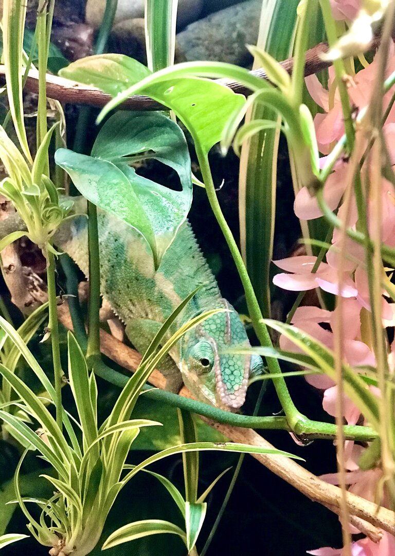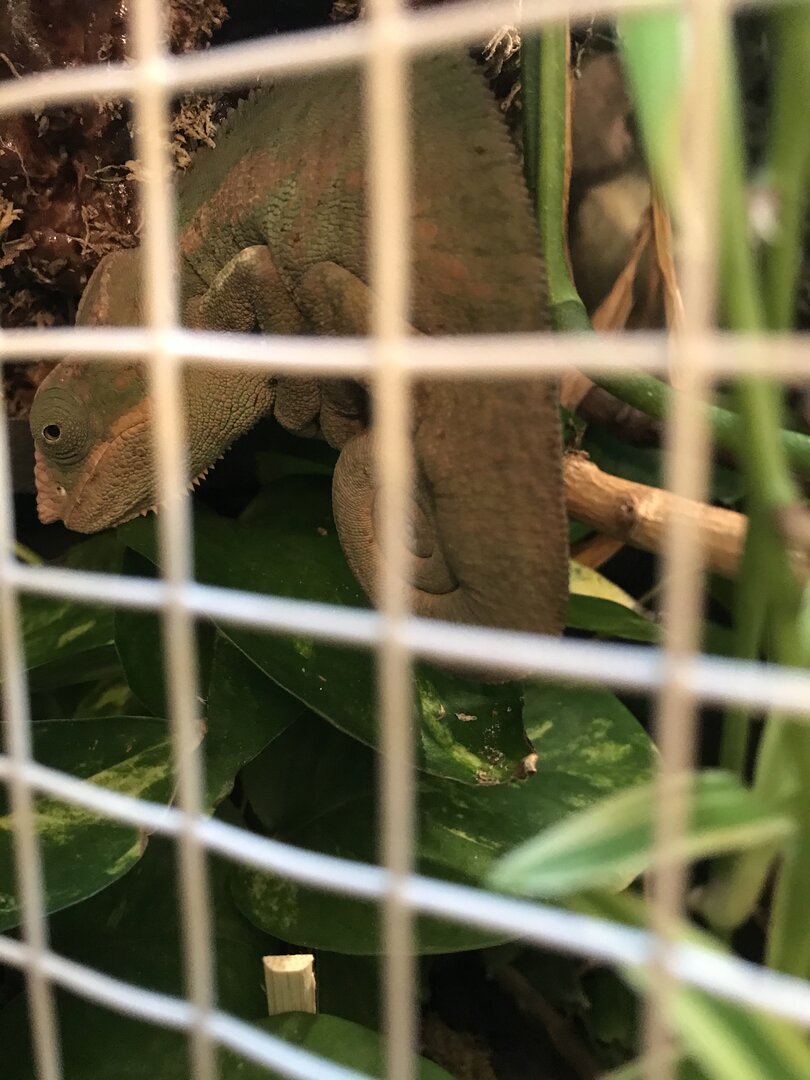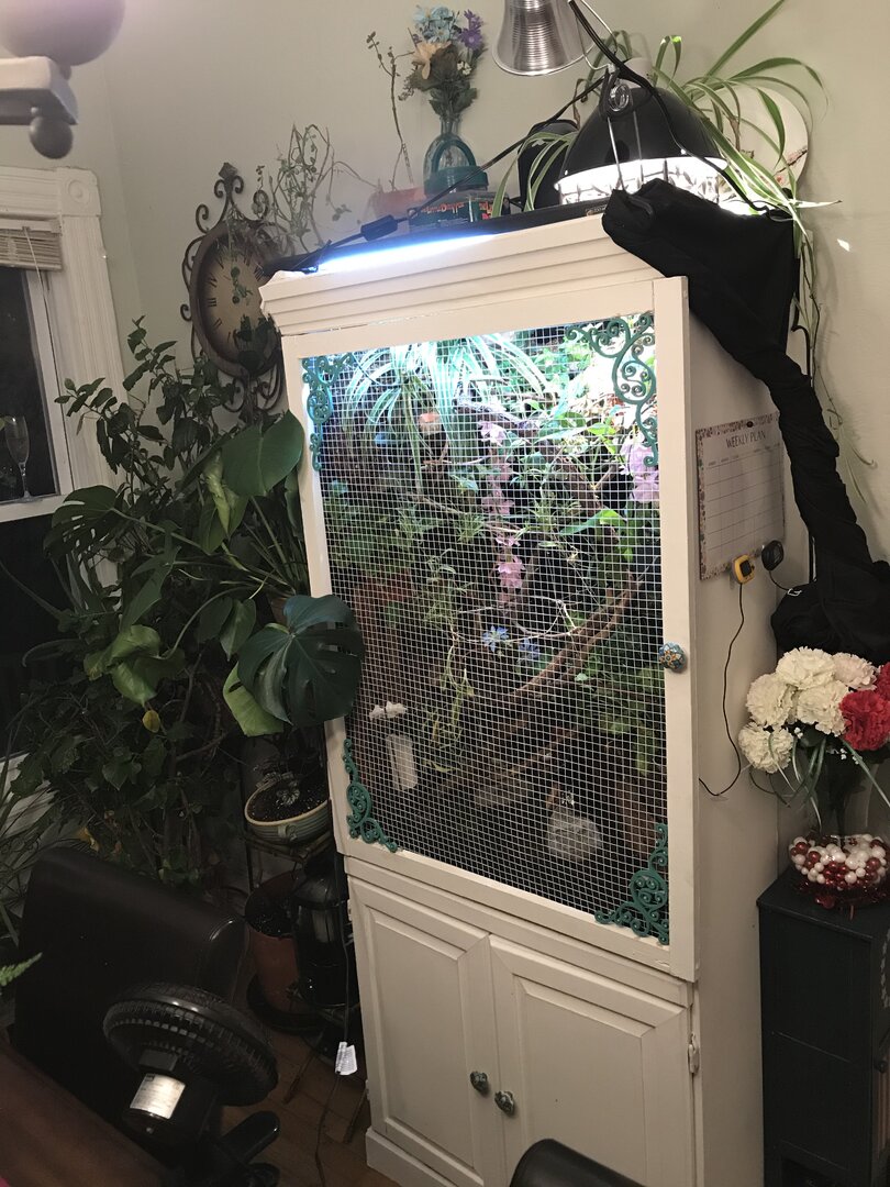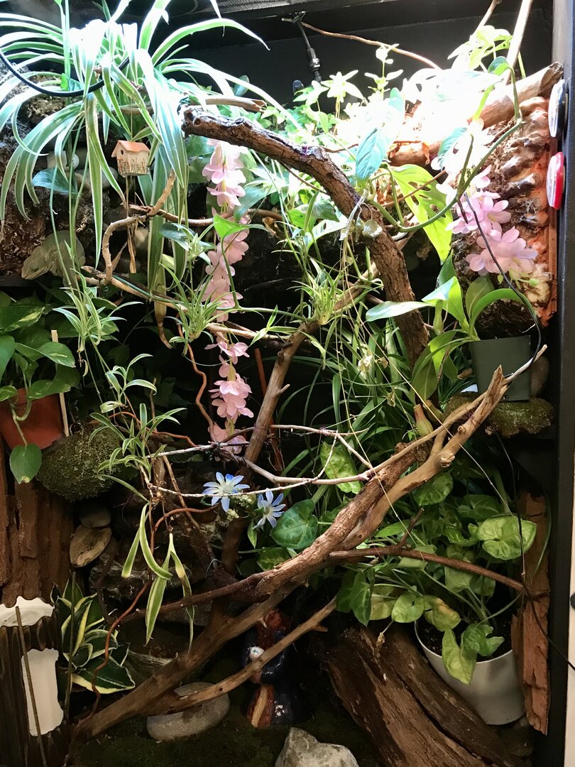 ). I usually gutload with bee pollen, carrots, mangos, collard greens & apples. I dust with calcium w/o D3 everyday but around once every 2 or 3 weeks I’ll do calcium with d3. Then I dust with a multivitamin every 2 weeks. I have a 30” T5 HO fixture & his basking area is usually around 85-87. I have automatic timers that turn lights on at 7am & off at 7pm. I have a MistKing that runs 3 minutes at 7:30am & 4pm. I also run several 30 second misting sessions too, in between those times (I do this because I notice he usually drinks as he walks...just licks the branch as he walks so I like to keep the branches wet for him. Usually everything is dry by lights out. I also have a little dripper & I run a fogger for 30 minutes every hour at night. His urate is usually an off white color. Not really beige but in between white & beige. His poop is moist & normal looking but I will add 2 days ago he took the biggest poop I have ever seen! Another thing I noticed in his droppings is sperm plugs! The first time I noticed these were about 1.5 months ago! I thought that was really young For him to start doing that, no?! Next, he has a fully bioactive enclosure, with isopods & springtails. I do have a carpet-type “real moss” on the ground to help against impaction, since the substrate underneath can range from chips to charcoal (Luckily I have never seen him walk down there & I hand feed him mainly (I do have a feeder down at the bottom but he doesn’t really use it much). All the plants in his enclosure are real (except for 2 long string of pink flowers for color, which I clean biweekly). As far as real plants, I have a Pothos, spider plant, ficus, Fittonia nerve plant, orchid, Monstera vine, bromeliad, ivy, ponytail palm & a small pitcher plant inside. I converted an old hutch so my measurements are a little off from the norm...it measures: 42” high / 30” wide / 20.5” deep. I do plan to add an addition to the top of his enclosure to make it 1.5 feet taller.