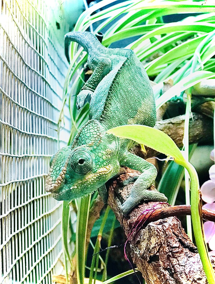 He is almost 7 months old & is a Nosy Faly Panther Chameleon. I got him when he was 3 months old & he came from Florida (Roberson Reptiles). I live a few blocks from the beach in NJ. I feed him daily, usually he eats 1-2 large crickets, several BSFL, 3-4 large silk worms & 1 “small” super worm (in that order