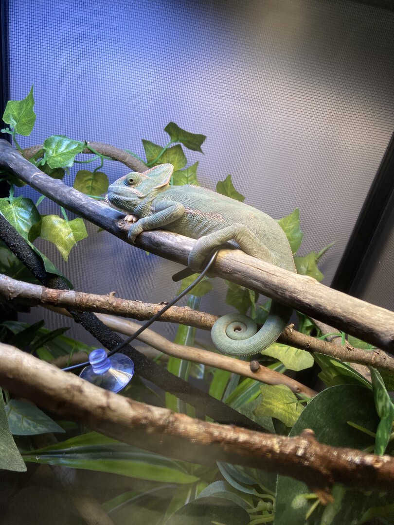 Also, she needs a laying bin. Female chameleons lay eggs even without ever mating. Females need a deep bin at the bottom of the enclosure for her to dig a tunnel and lay the eggs. Like i said, it should be pretty deep, and filled with a moist enough substrate so that the chameleons tunnel won't collapse. Also what temp is the basking spot? The lamp looks pretty far away from what I assume to be the basking branch.