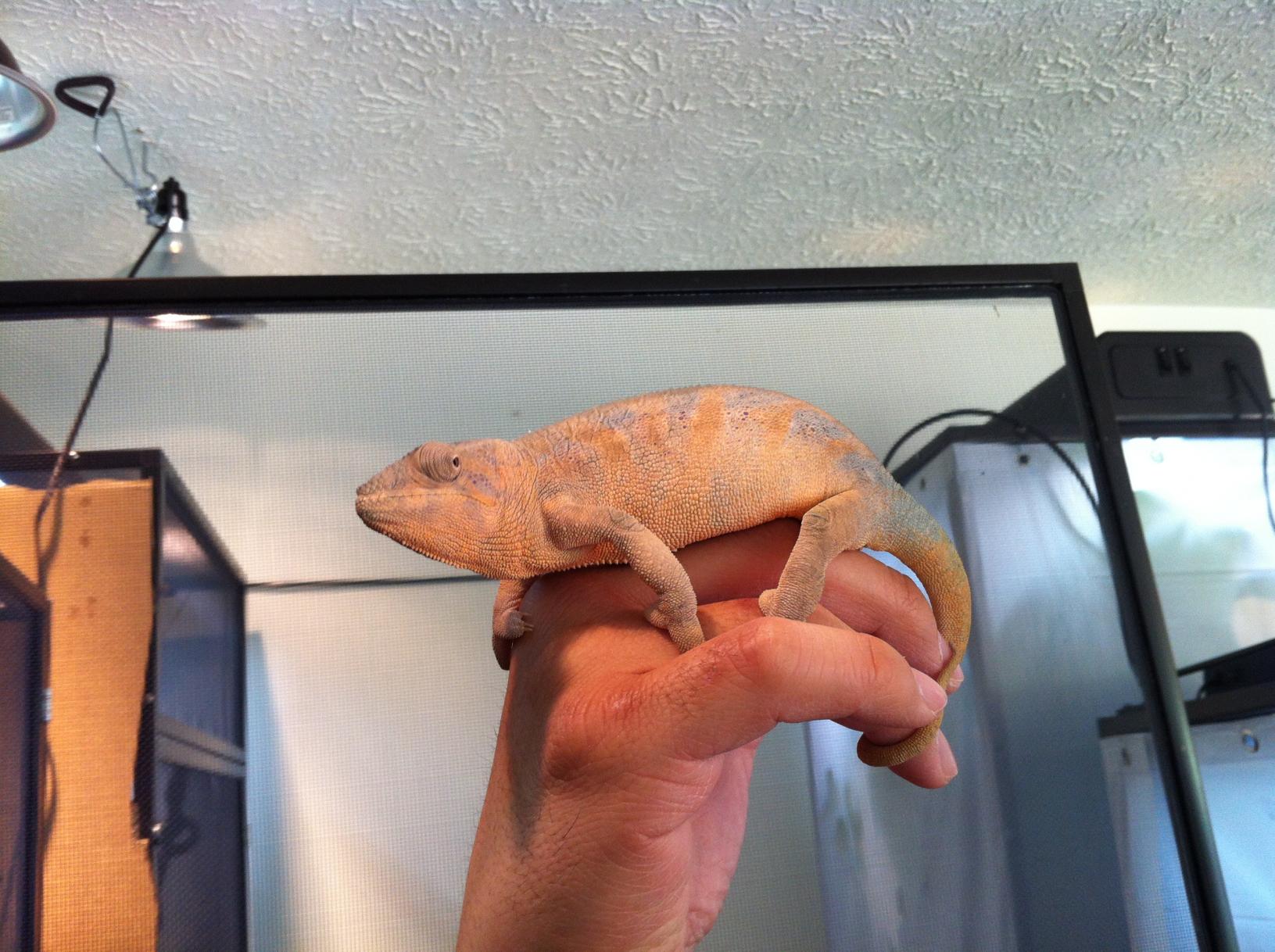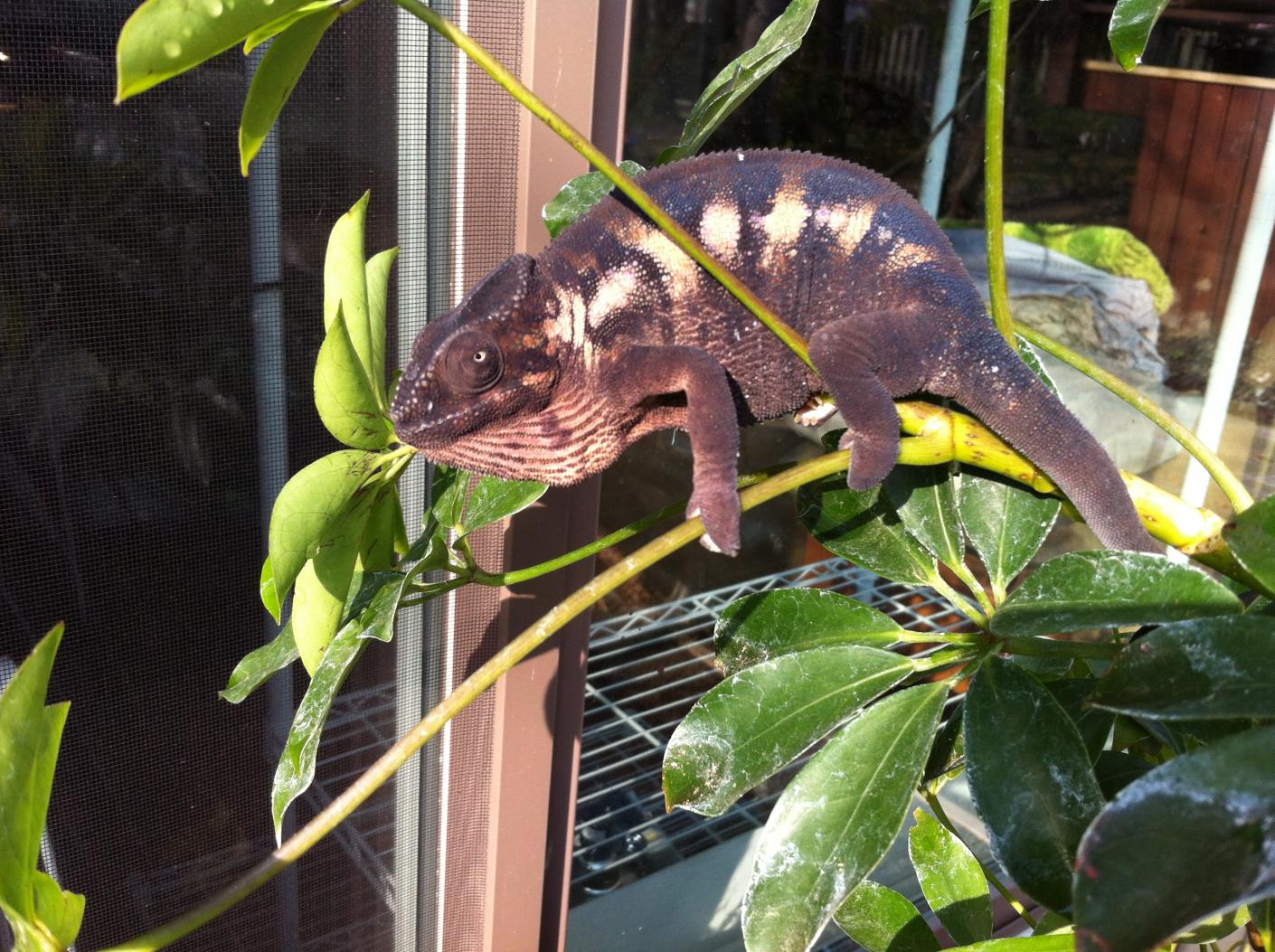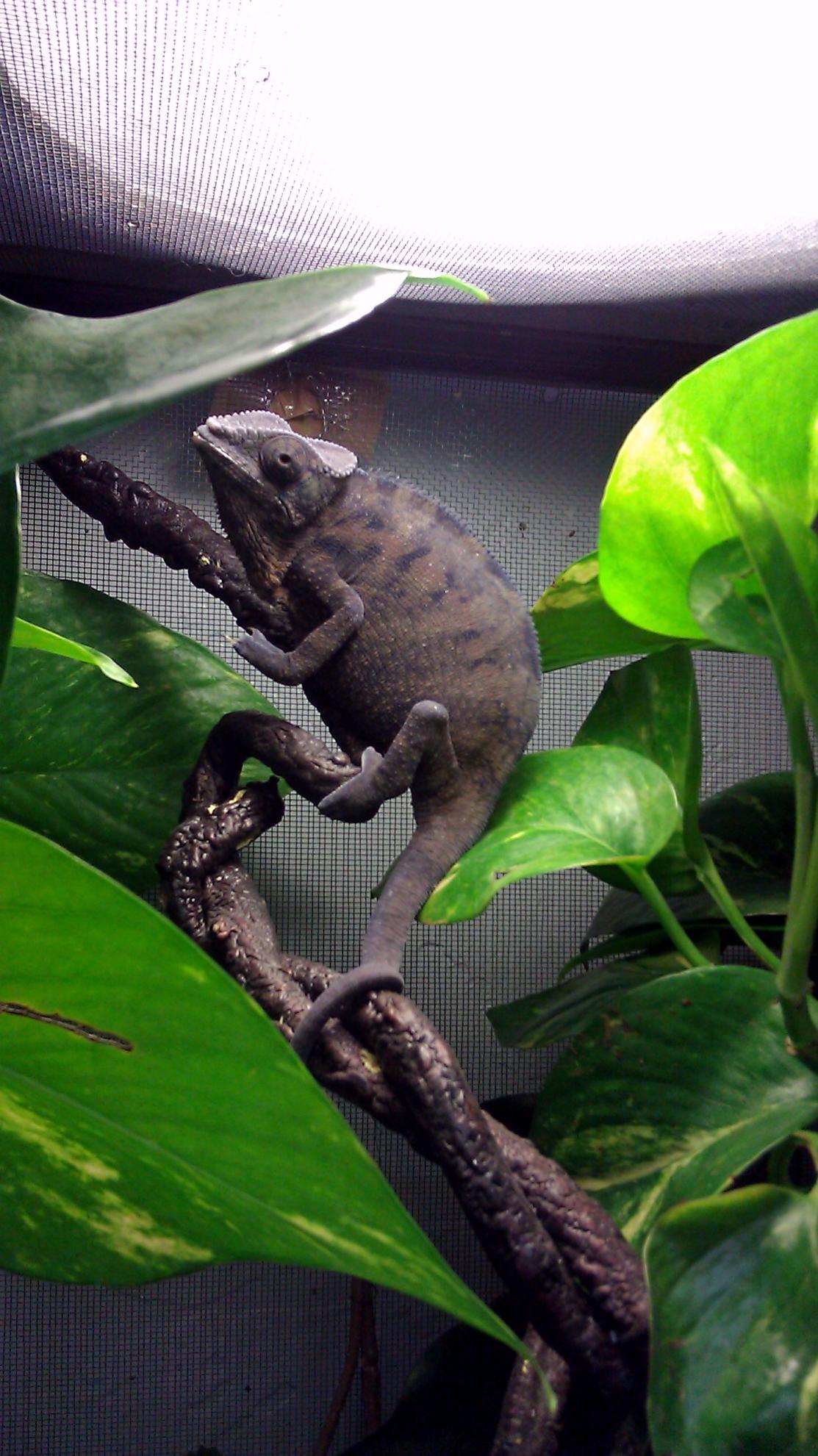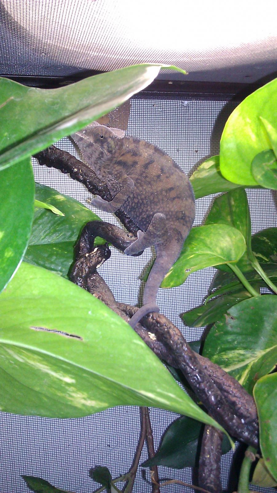 I noticed this morning that my female panther chameleon was displaying some dark grey and pink colors.. So I thought, maybe she is starting to become gravid? But I wanted to post a picture of her on here to see if anyone could tell me.. she may look kind of small compared to the leaves in the picture but she is about 2 years.. But if she does look gravid, how long should i wait until I introduce the male to her?