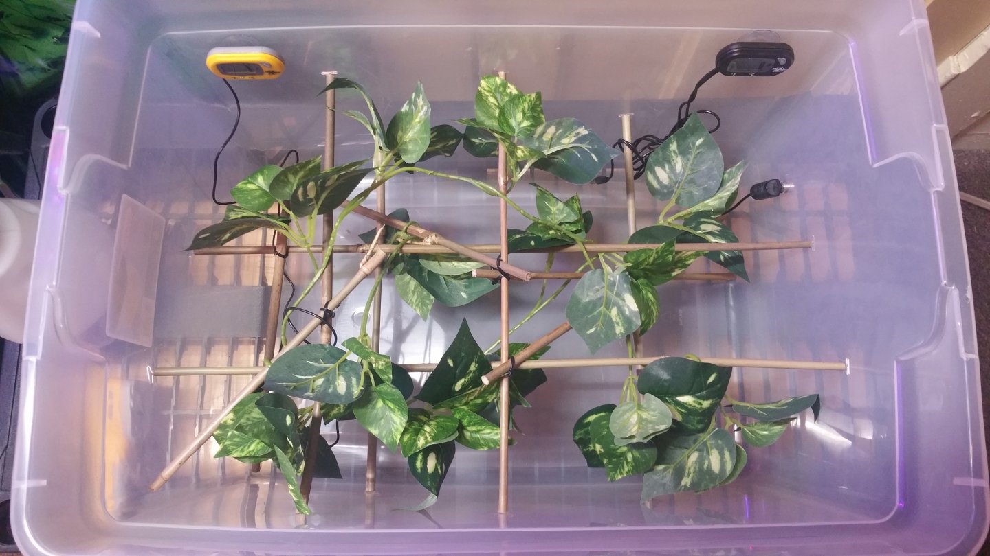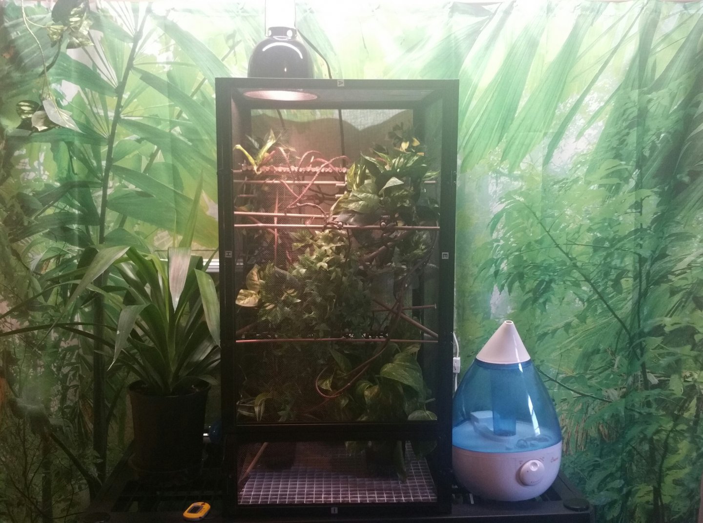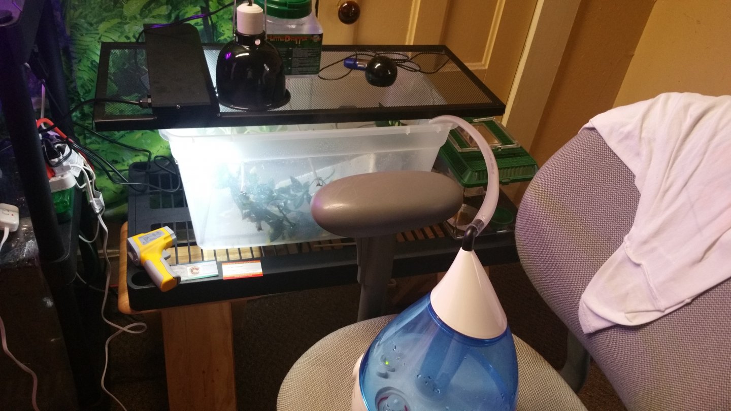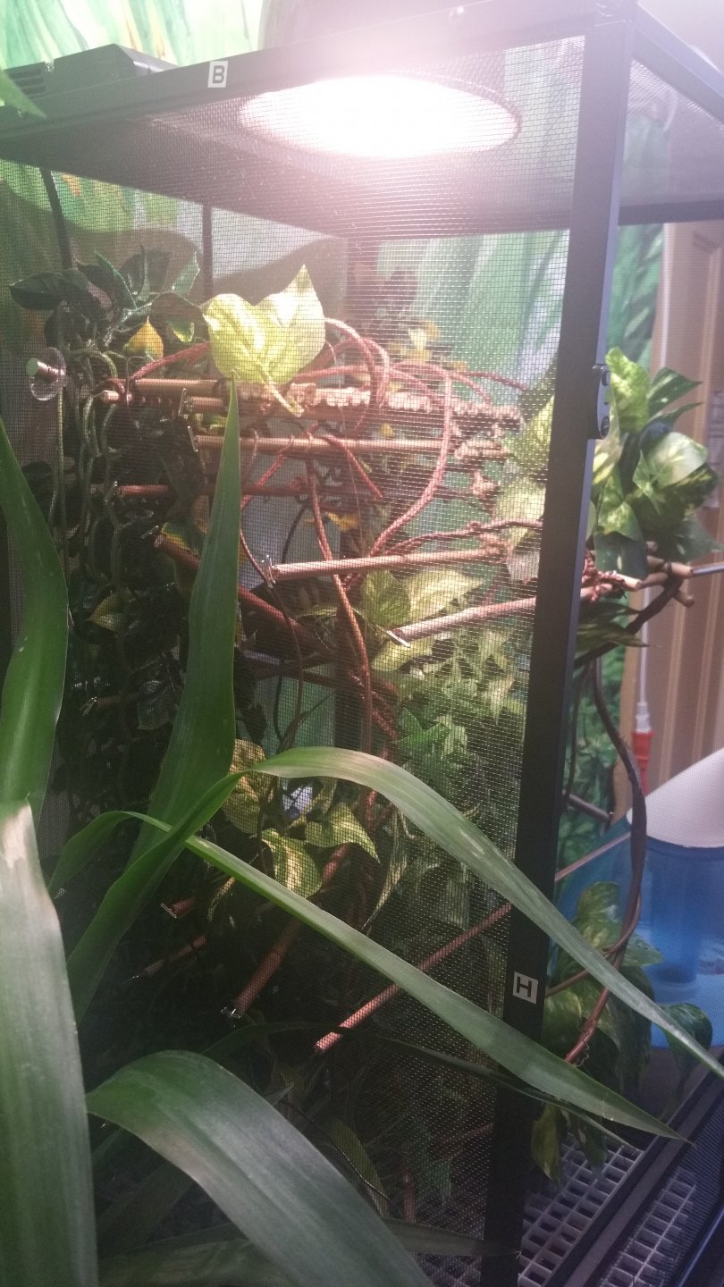 Iv had my little guy for a week now. He eats, is very active, friendly and gets 2 mistings a day for about 2-3min. I also have a dripper. And he Enjoys getting misted. Once I mist I walk away so I dont know if he's licking some of the water off the bracnches and leaves but today I noticed a little discoloration in his poop. I see no signs of illness such as sunken eyes, weak grip etc. But his poop Wasnt like that yesterday. Today is his first time shedding since iv had him. I sprayed him this morning with Zill Tropical mist to help with the shedding after misting and I just got home and noticed he shed off his whole body, just one small piece left on his tail. Letting him hangout in his reptibreeze for a bit, then misting again in his temp tote/tub. It was a recomendation from Bruce Gailbraith to house him in it for 2 weeks to get acclimated . All pics were just taken.