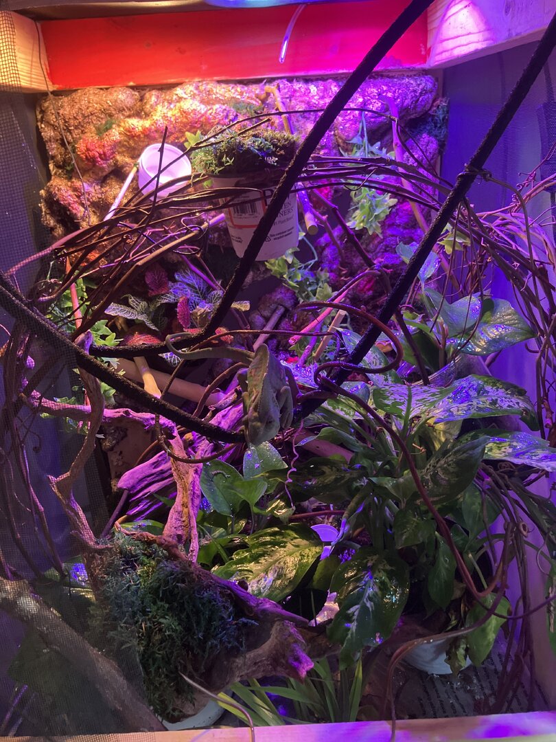 Multiple live plants with live moss, I also have real and fake vines as well. I honestly just want to know if it’s good enough for my little dude!!! It’s my first custom built cage, it’s enclosure is roughly 4ft x 4ft x 3ft