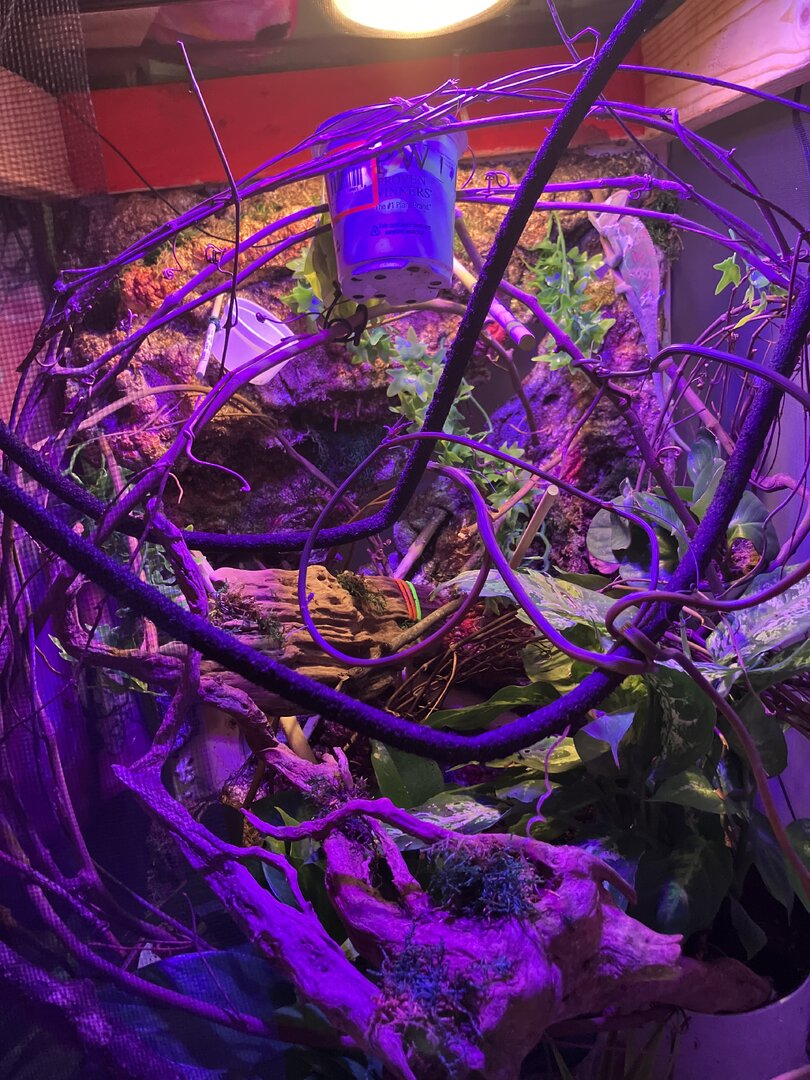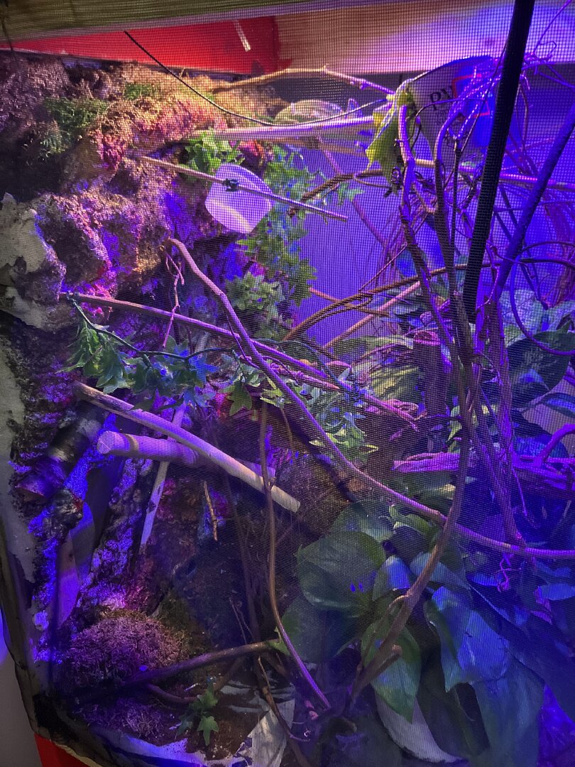 So much room for your guy!! Minimum size is 2x2x4 so that’s awesome! I would suggest removing the colored lights and stick with plain white as the colored ones can hurt their eyes. If you want, I can give you the form for a full husbandry review.