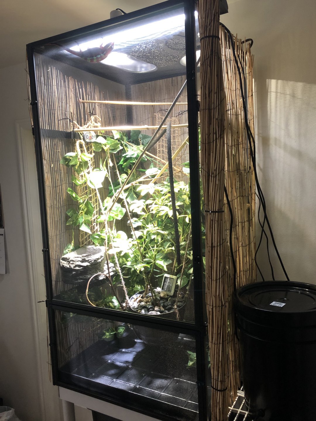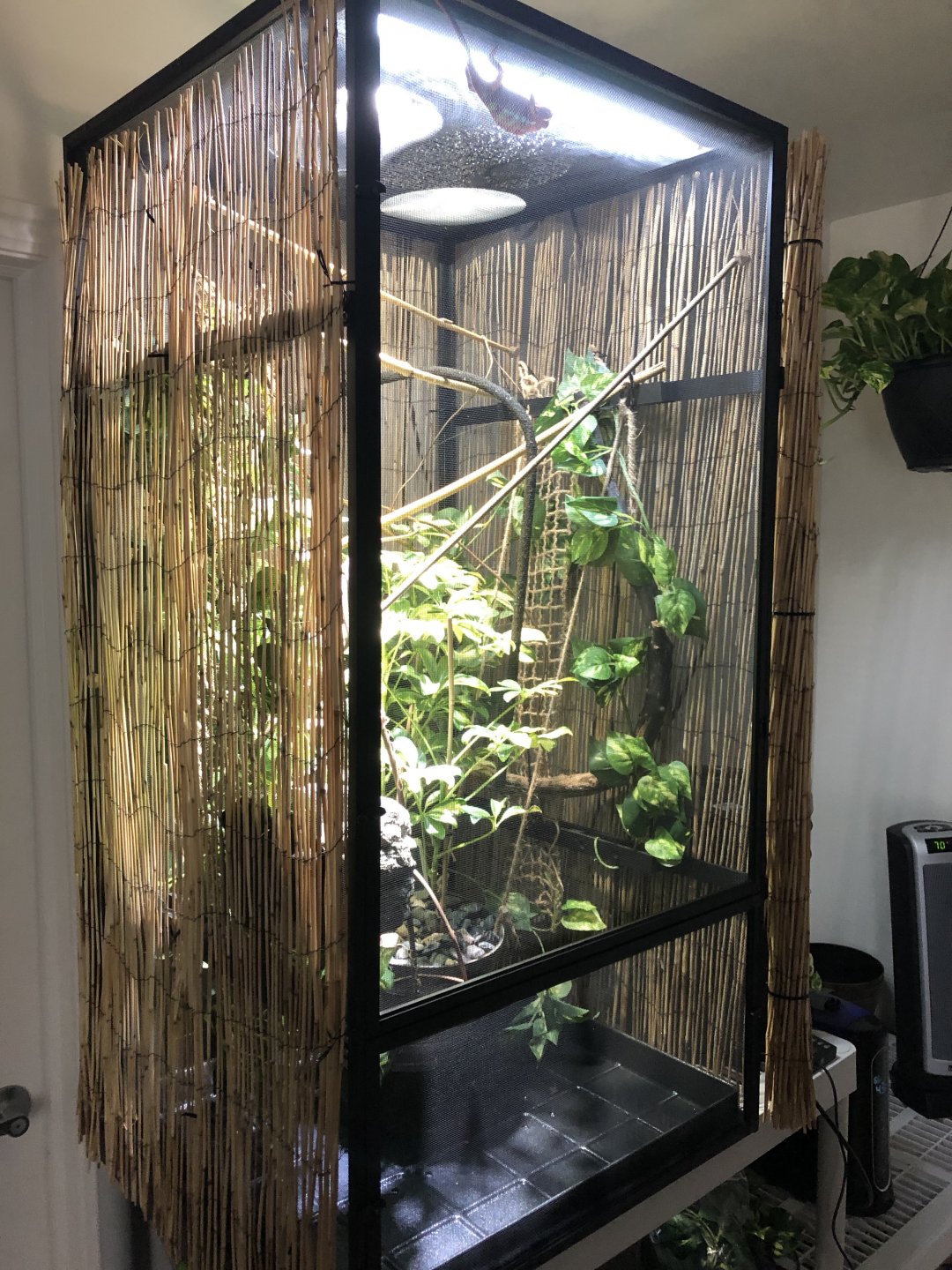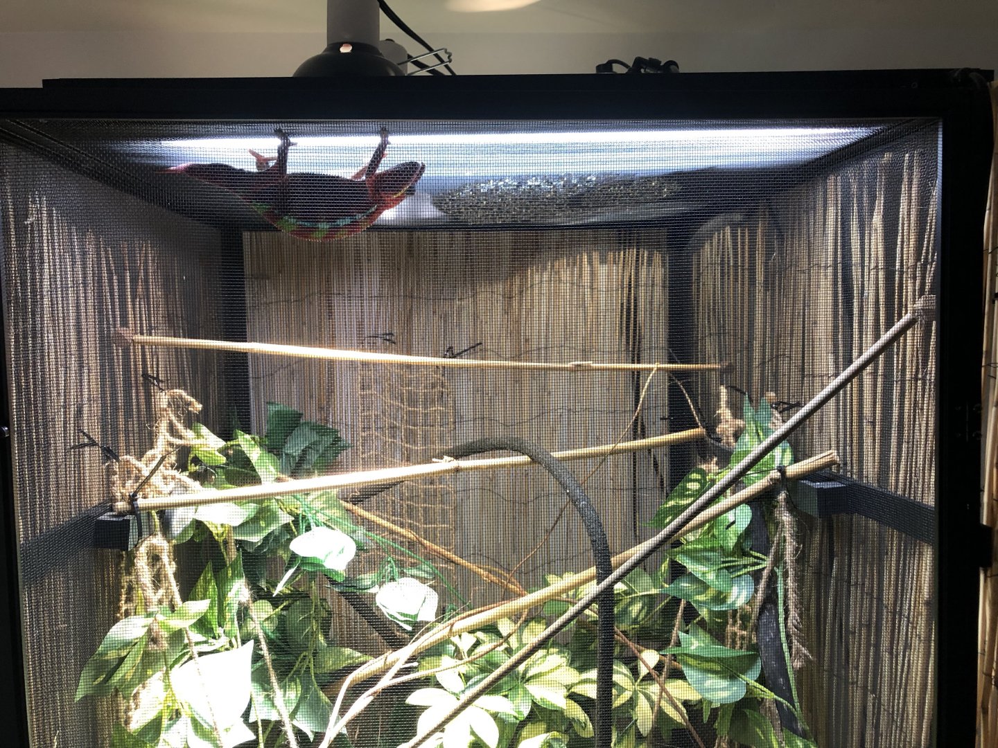 - Placement – His cage is in my bedroom/office since I work from home. His cage is only about 6 feet away from my desk that I work at but I have reed fencing all around his cage except the front and lots of leaves on the sides to give him some more privacy. Also my back is always turned away from him while I’m working so he doesn’t feel like I’m staring at him. Its not near any fans or vents.