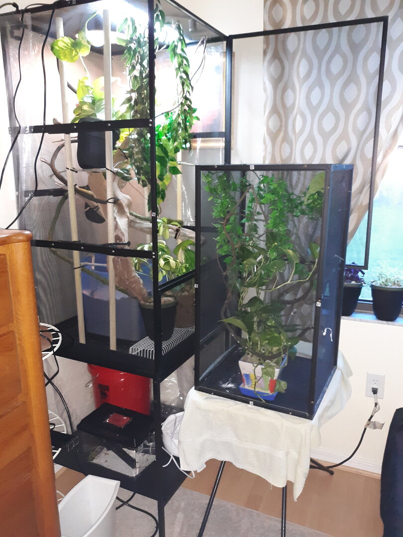 This is what I did with the smaller enclosure. Having a female I had to have a lay bin, which took a lot of space. The second is her upgrade. But I’ve since added lots of branches.