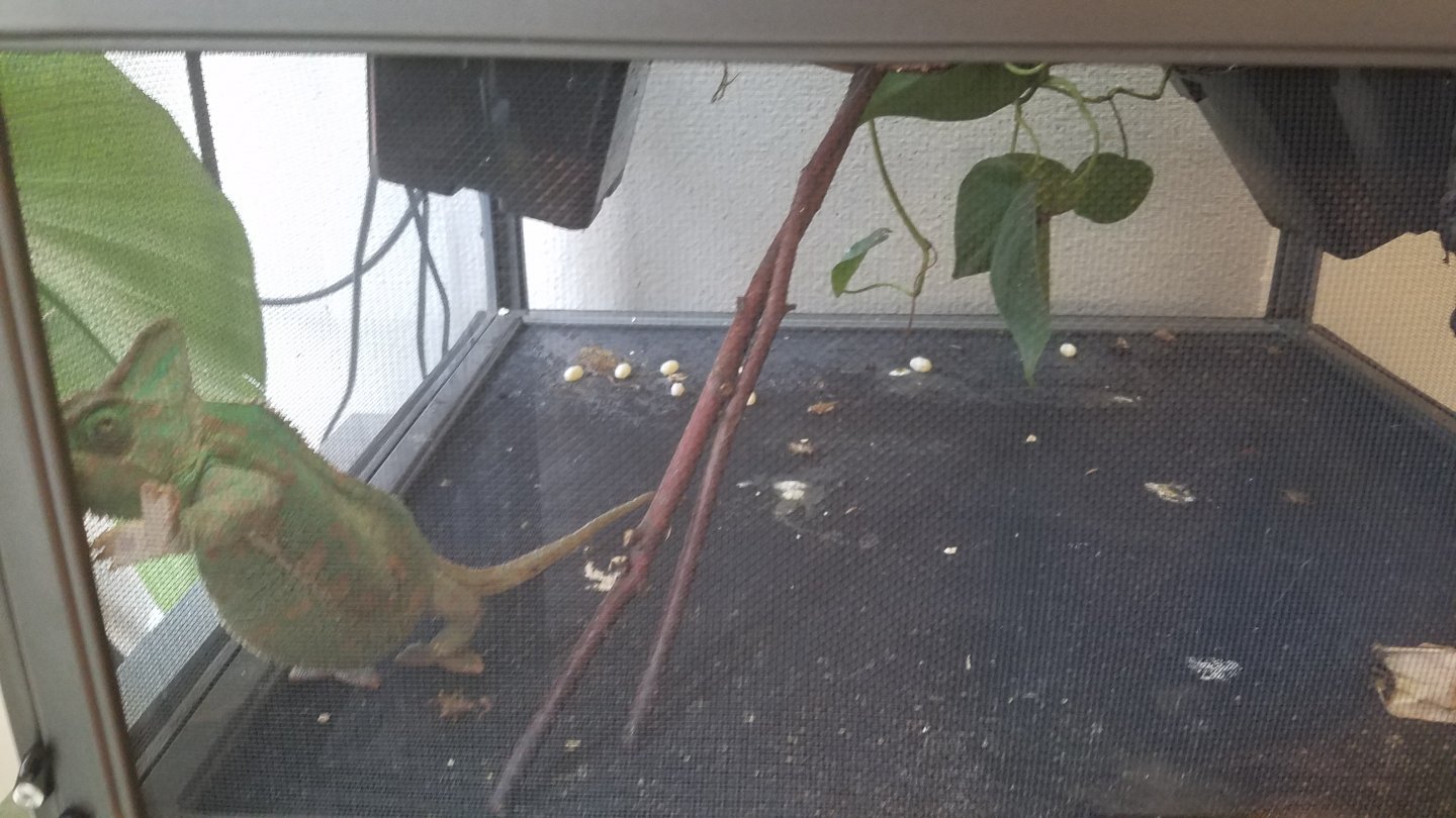 My three year old female veiled chameleon has laid eggs in her laying bin before so when her belly started looking plump and her behavior in the cage started acting different (Climbing to the very top of the cage then falling down to the bottom, over and over again), I figured it was time for her to lay again. Over the past few days it seems that her grip strength is very low and the falling from branches is happening a lot more than usual. What I'm most concerned about is that she is randomly throughout the day laying eggs (picture attached) in random spots of her cage. Maybe since the weather here in Oregon is getting colder it might be effecting her? Thanks for the help!