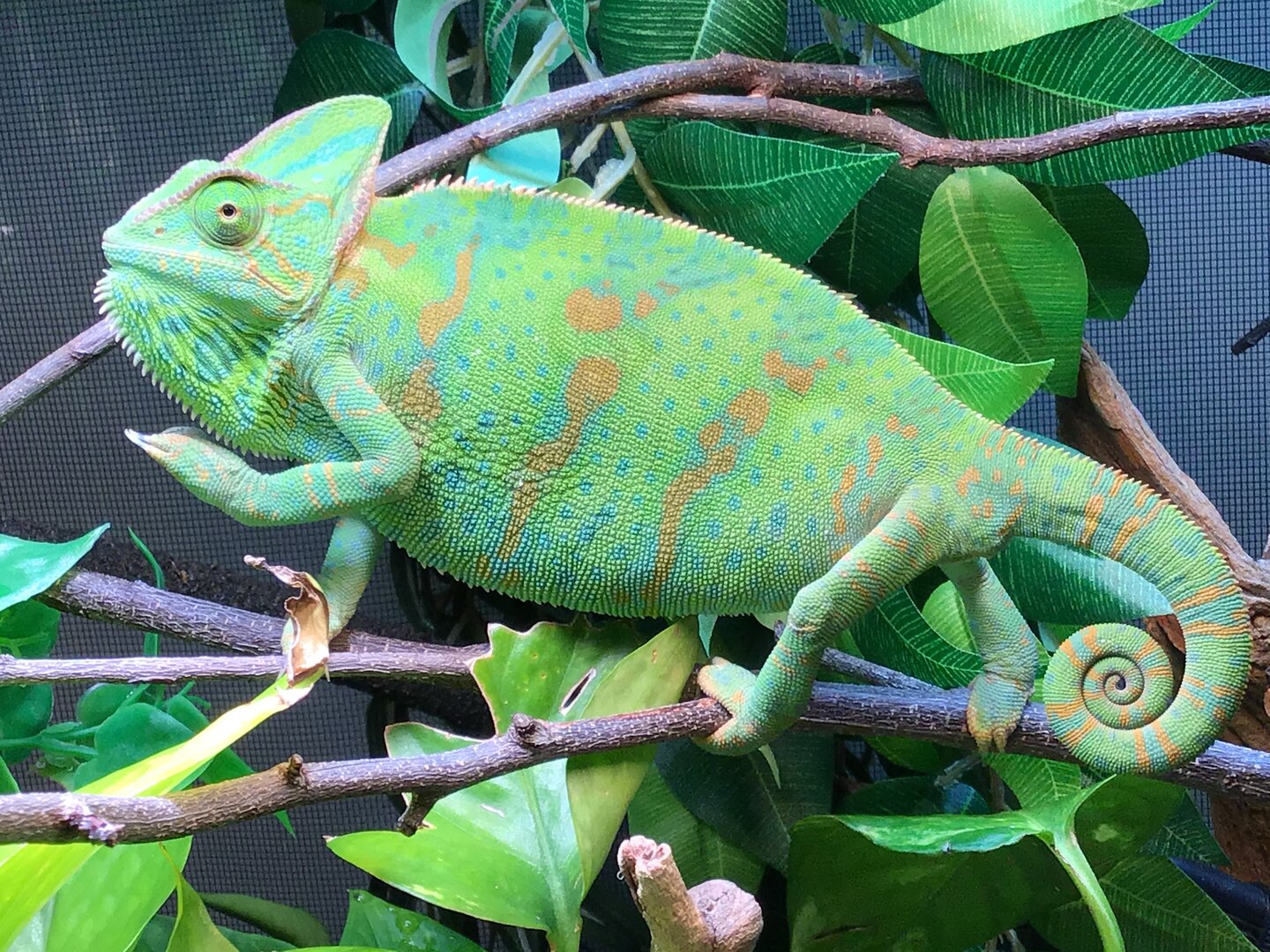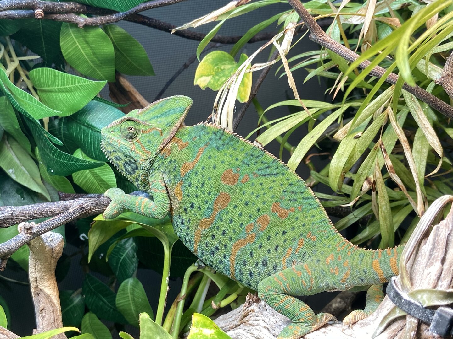 • Your Chameleon - The species, sex, and age of your chameleon. How long has it been in your care? Female veiled. I was told 3-4 months possibly 6. She definitely is older than 3-4 months. She’s got her big girl colors, so she’s definitely at least 6 months old.