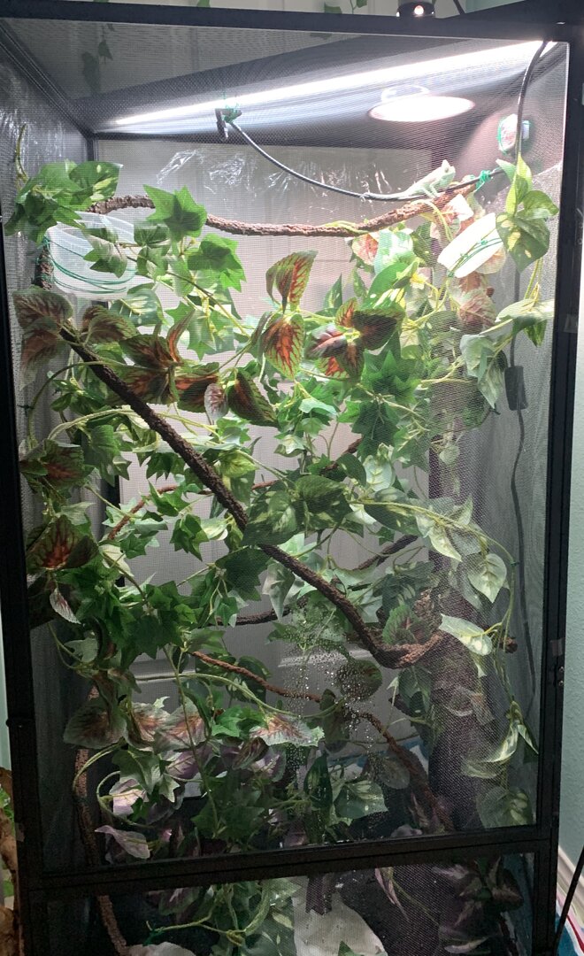 - Cage Type - Cosmo has a 24x24x48 screened enclosure with clear saran wrap on the outsides. This may sound a little weird but it is completely safe and is only to make sure his humidity stays up (considering my dry climate.)