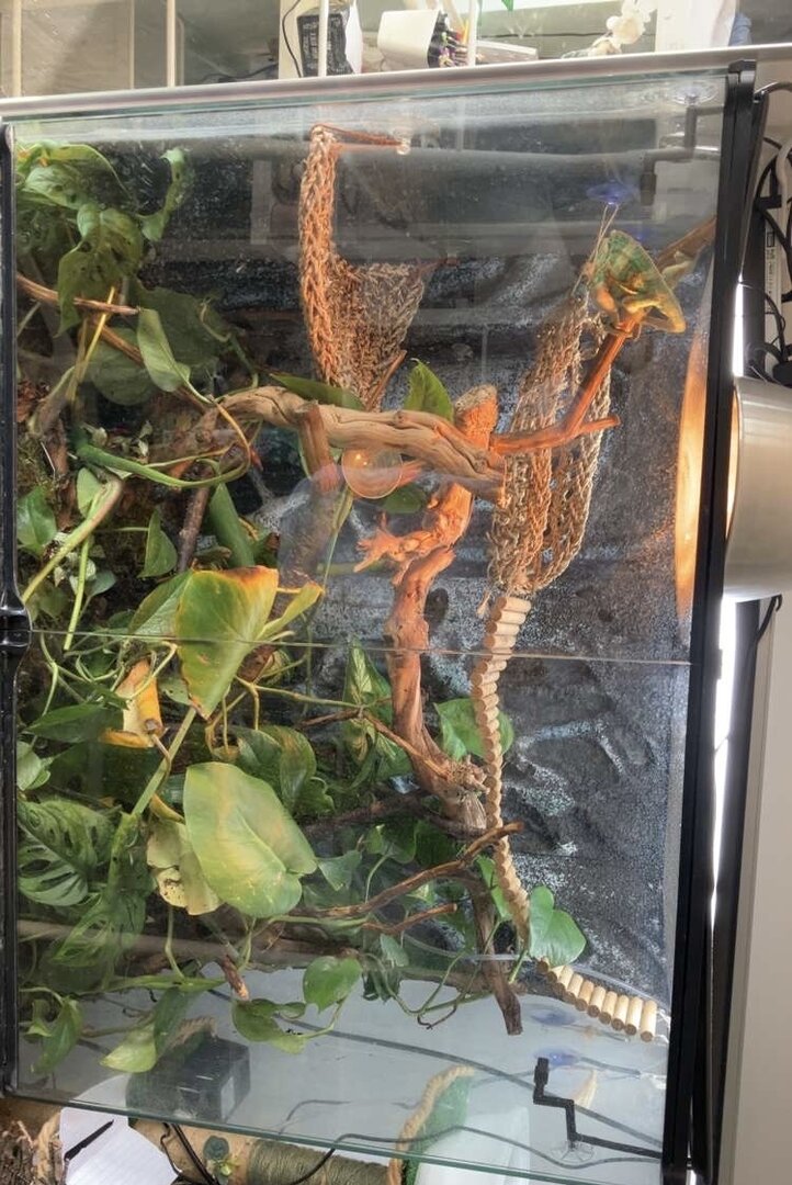 Anybody got any improvements or ideas or any advice for my chams enclosure. It is fully bioactive with a wide range of plants. He has a 60 watt heat bulb and a t5 uvb strip light. He has drainage balls and charcoal chips for drainage and a mixture of coco soil and top soil for substrate however the bottom is covered in moss and leaf litter. The hammocks and bridge are only temporary until I have something to fill the top right corner for him to bask under his uvb.