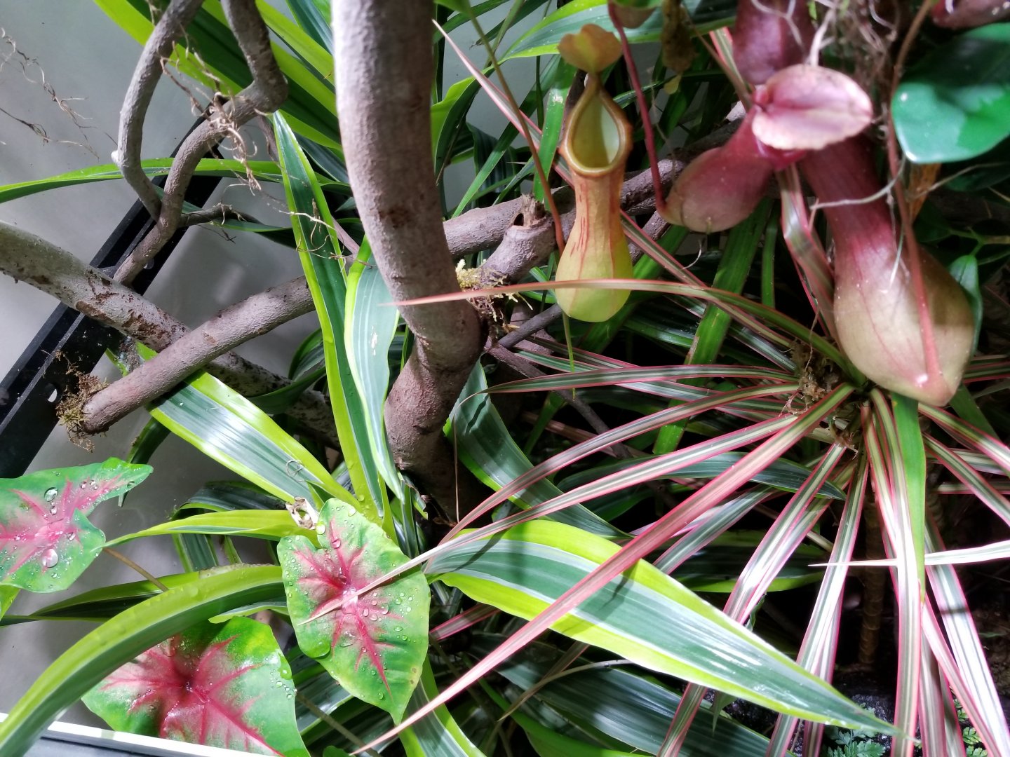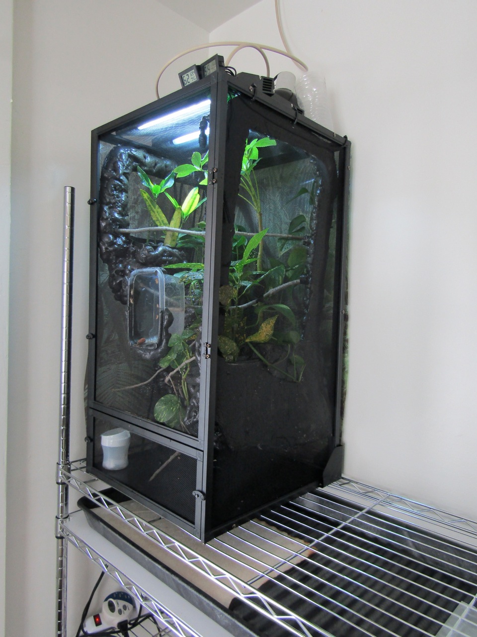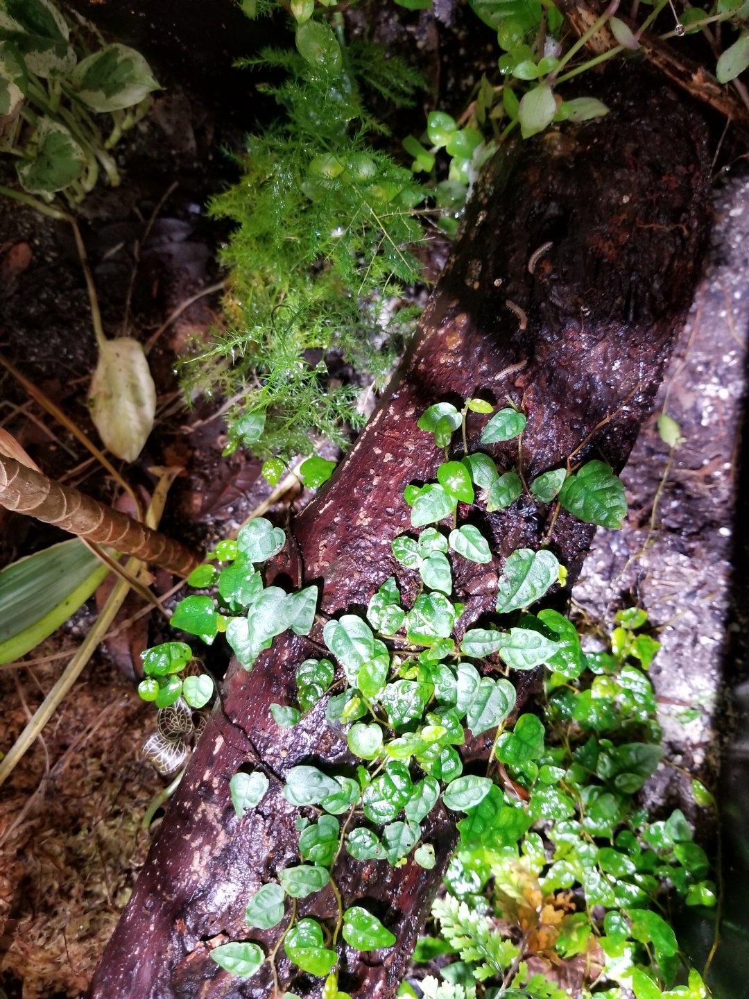 So my thought is to do a custom planted wall, but not a planted bottom. I'd plan on using spray foam, cork bark and some driftwood to create a natural looking wall with pockets to hold planters or planted plants. I'd hope this would help maintain higher humidity while not misting. I suspect that better humidity retention throughout would always be better. I also feel like the smaller plants (with leaves closer to the base) would be better at holding humidity then something like a ficus. It should also give me more anchor points for vines and other climbing fodder.