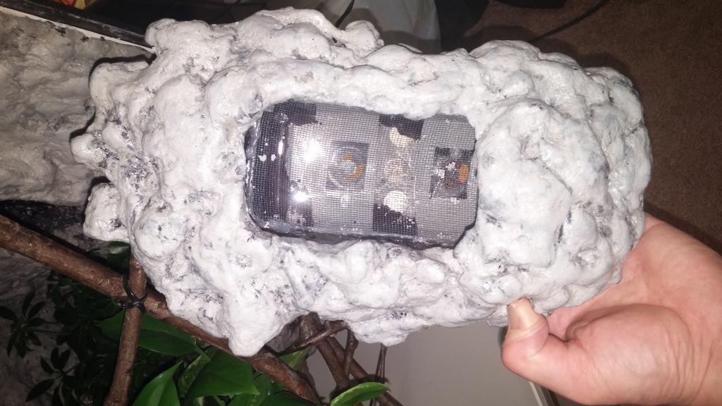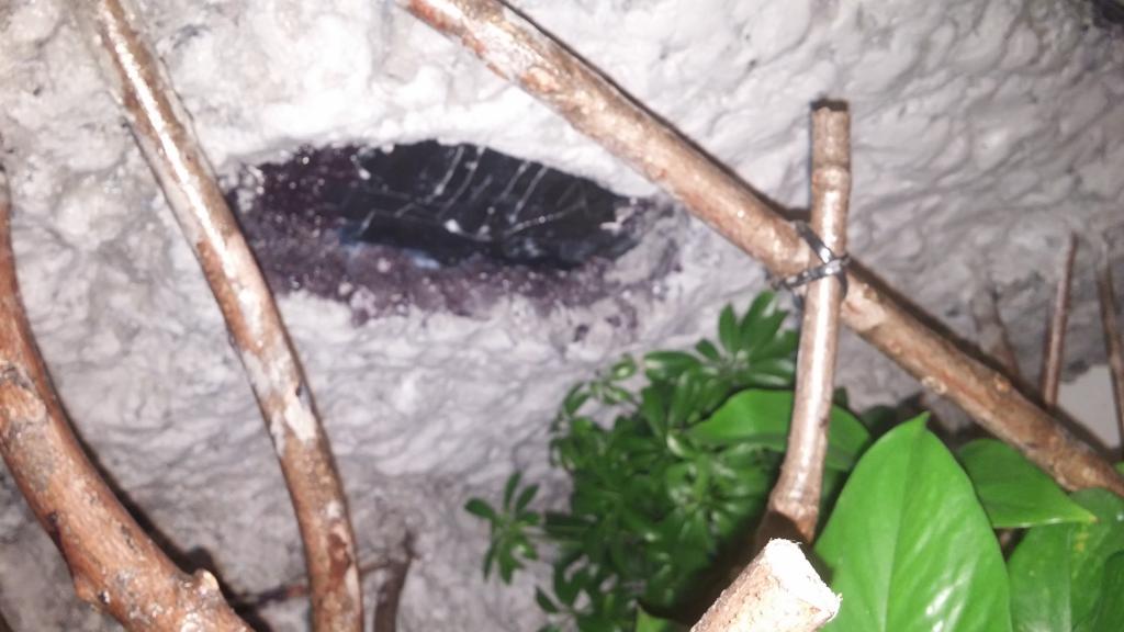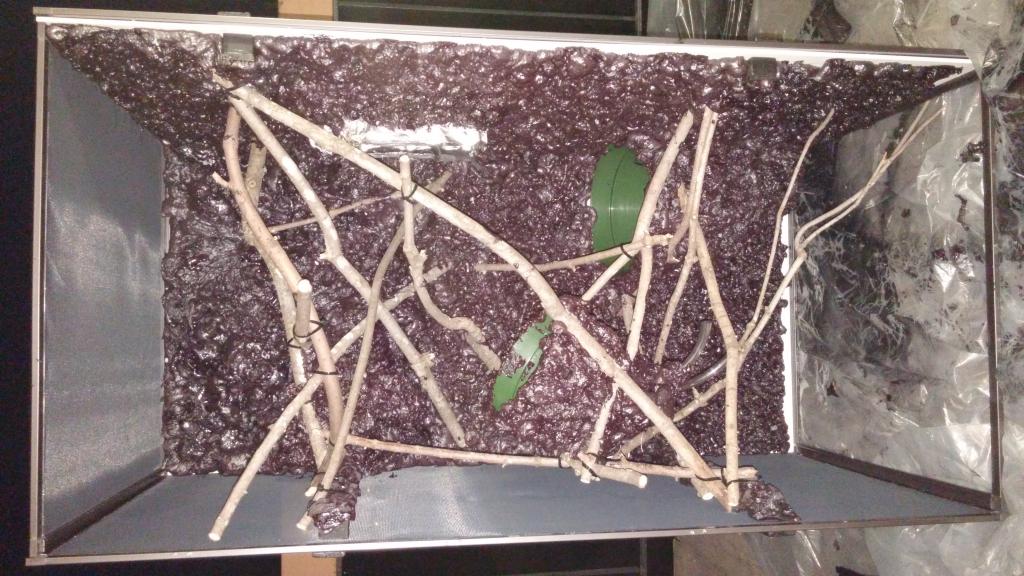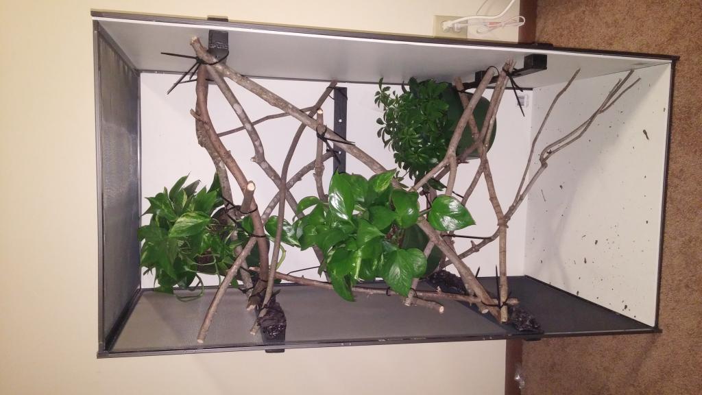 So, I've been working on this for a couple months... It's basically a typical screen cage/Dragon Strand hybrid, front/side/top screen, back/other side pvc sheet. Choose not to put in the upper feeding door for better viewing, it's 24"x24"x48". I built ledges, connected branches with zip ties and empty pots, covered the pvc walls with Great Stuff foam, grout for natural stone look, and polyacrylic-ed them to waterproof. Made a built in/ removable via magnets Sunny D style feeder cup. Installed mist king nozzles and a rain dome, and placed live plants growing out. Just waiting for LYR to get Tropic Blaze quads back in stock. Thinking it turned out perfect, and Dexter should be large enough for it in a month or so... Tell me what you think!!