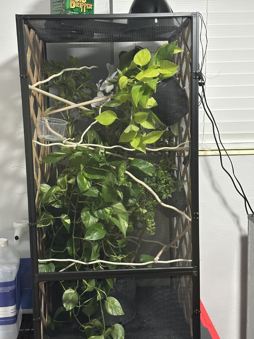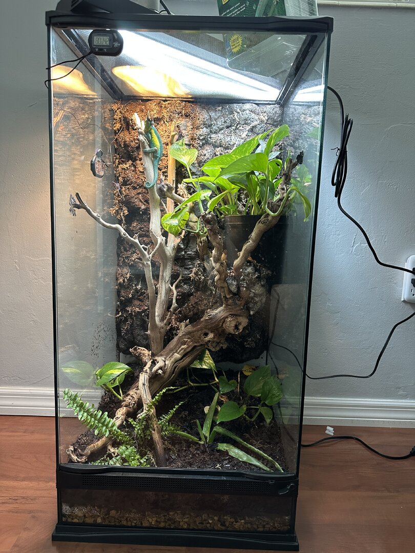 Hey everyone. First post here as a new chameleon owner. Last month near the end of December, I bought a jackson’s chameleon! I had researched and thoroughly looked through all best possible appliances and cages for my guy. Ultimately, I started him off in a glass palidarium (18x18x36) with a double light heat dome with concentrated bulbs (yikes). Throughout the time I got him, I kept on researching and just kept it going and going. As time went on, I learned more and more about the pros and cons of certain enclosures and quite literally everything you can think of. As time went on, the humidity in the glass enclosure became too much to handle and mold started to grow. I was already planning and looking into screen enclosures at the time and that sealed the deal for me. After spending money on a glass enclosure, and then immediately investing in a screen enclosure, I will show you the upgrade my little one got. Personally, I feel very much accomplished with his enclosure. However, if there is any advice at all that you guys would recommend, I am all ears! As of now, Ankle (my chameleon) has a reptisun t5 5.0 uvb light, a 50 watt heat bulb in an 8.5 inch deep dome, and a big dripper. Currently on order, I have a mistking and an arcadia jungle dawn LED to further support the growth of my plants. I will also be buying a repticooler to further give my guy the temperature drop he needs for the night (I would appreciate any other ac recommendations that exclude window ac if there’s anything else). There are holes drilled under the big umbrella plant in the center for drainage, and I will be getting a terrarium controller extension block to give him the perfect 12/12 hour day/night cycle. One thing I am curious of is where to buy a nice backdrop. I have been trying to find a 24x48 tropical style backdrop and I could not find anything; it was all custom and the price was a little steep for if being just a vinyl backdrop. I want to use this to further keep the high humidity in the night time. I am debating just buying a black shower curtain as a substitute. Anyway, here are the pictures of the old and new enclosure (Ankle is in both pictures btw, try and spot him!!)