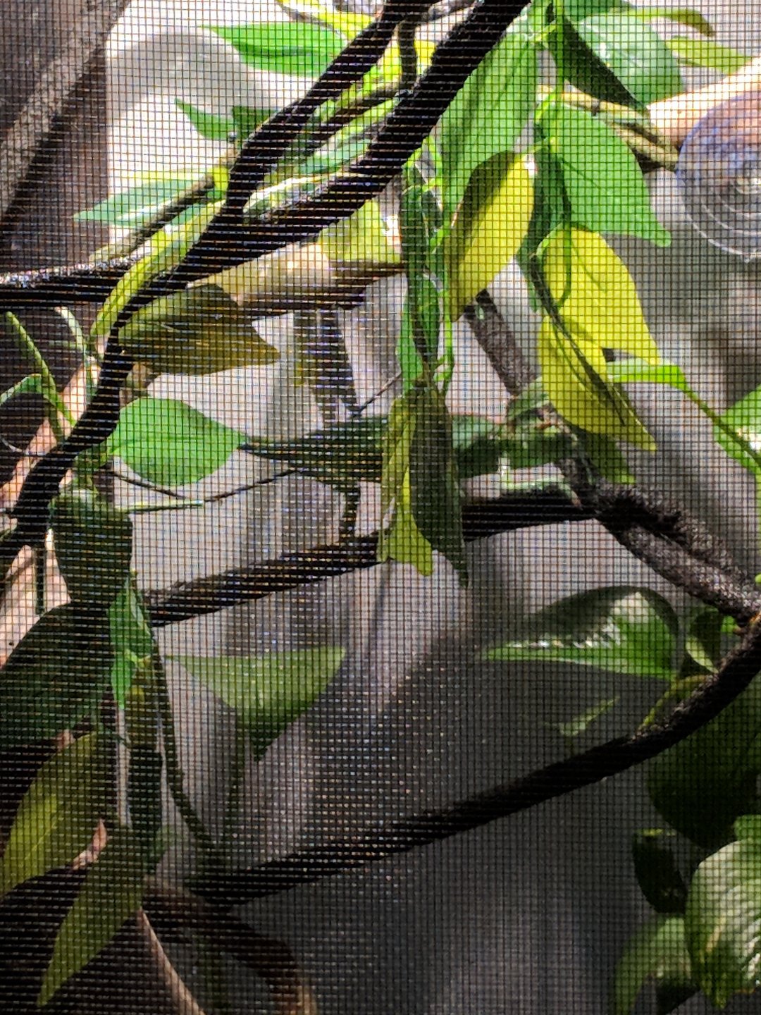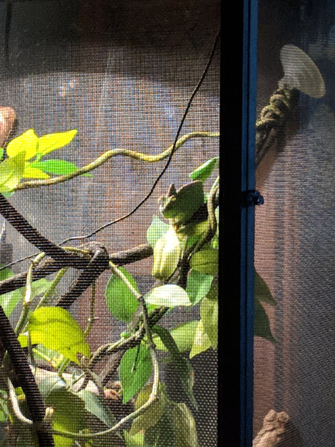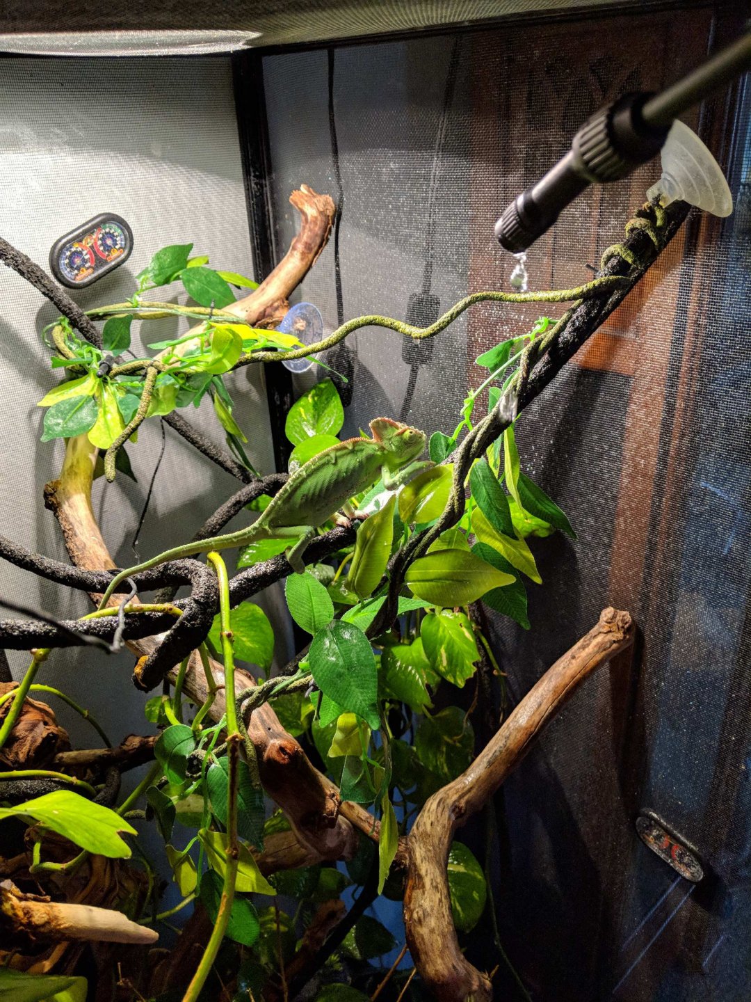 Funny story. I had to work, so Dave was home with her. He did her showers twice, and couldn't find her! He seriously thought she escaped, so he physically went searching in her cage and couldn't find her! He was worried, but I know chams. She was hiding in plain view, in the middle of the cage. I guess I have good cover for her! Took me all of 5 min of looking to find her, after lights out.