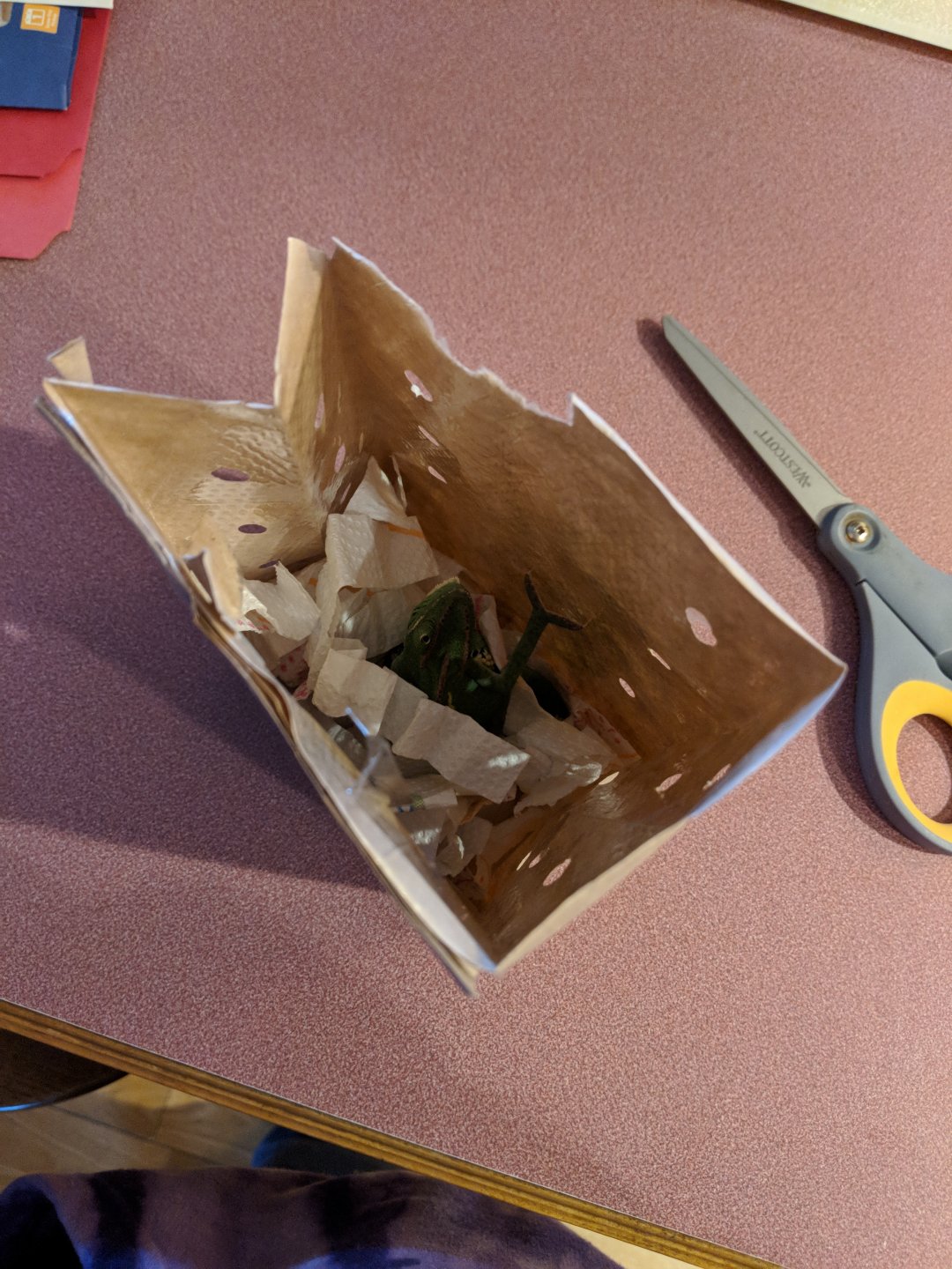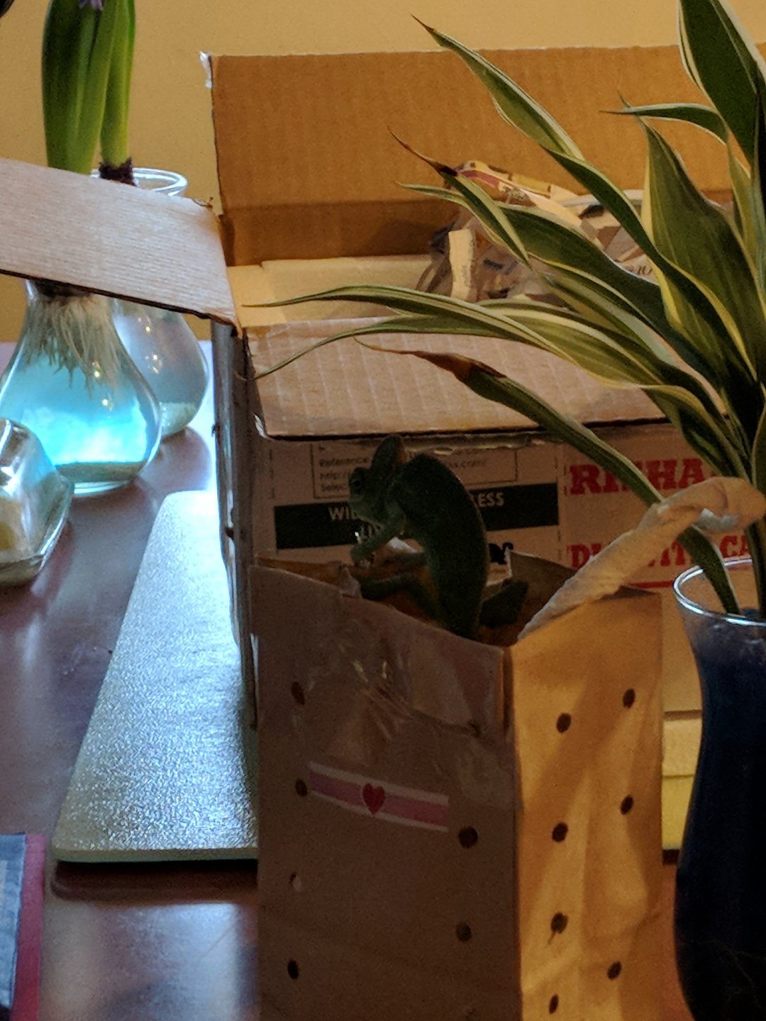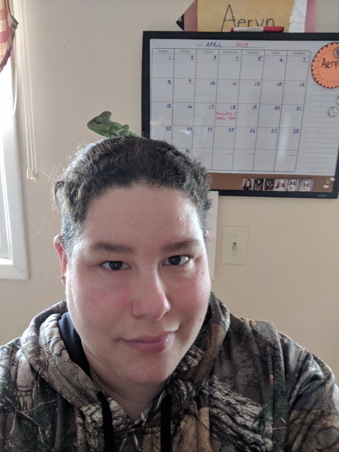 Funny story. I had to work, so Dave was home with her. He did her showers twice, and couldn't find her! He seriously thought she escaped, so he physically went searching in her cage and couldn't find her! He was worried, but I know chams. She was hiding in plain view, in the middle of the cage. I guess I have good cover for her! Took me all of 5 min of looking to find her, after lights out.