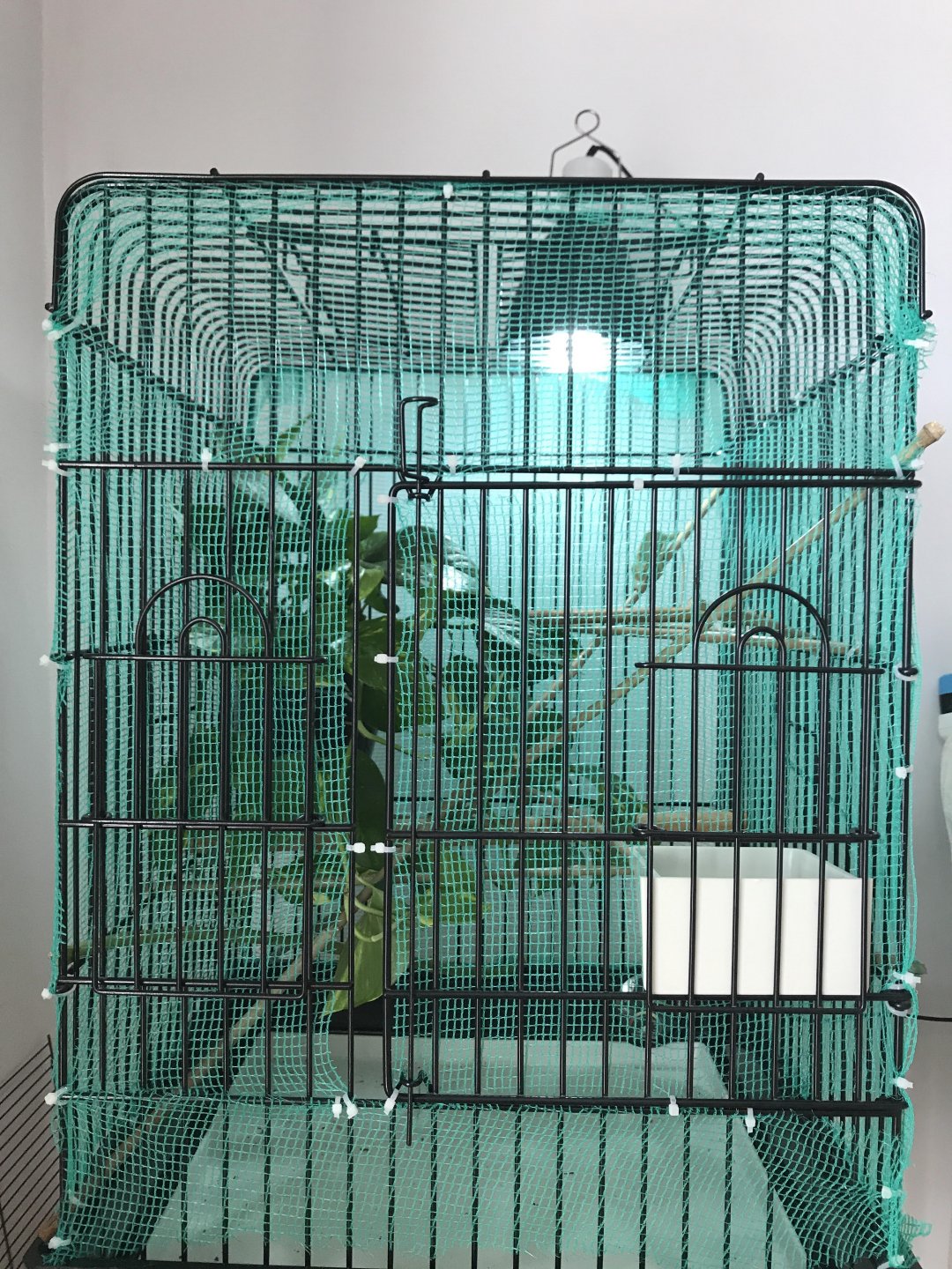 Here's what I currently have, the habitat will be temporary until she grows large enough for more of a free range type habitat. It is a 18x18x36 birdcage that I added mesh to so she will not go through the wires. The wires are plastic coated and the mesh isnt too close together so she shouldn't have any problem with her feet. I had unused bamboo sticks from the garden that I secured into the cage however I am thinking about replacing them with something less slippery. There is nothing at the bottom of the cage and it slides out so I can clean it easily and without disrupting her too much. I am about to place another live plant in the cage to give it much more foliage.