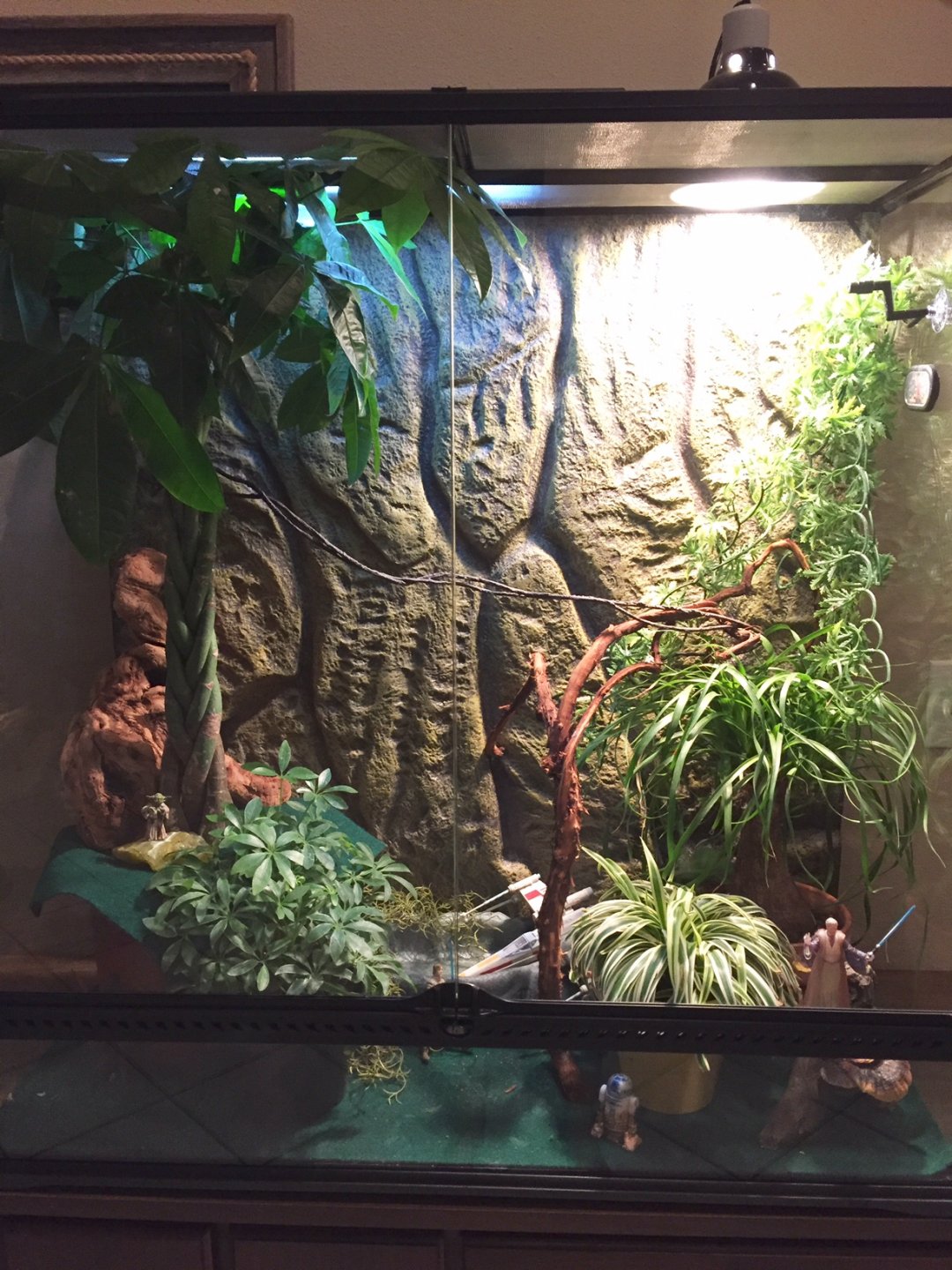 I've been considering it for my Veiled due to the fact that he is in a 36x18x36 enclosure so not only will the UVB reach far down into the tank, but should penetrate through a lot of the foliage he hides in, too. And it seems easier having an "all-in-one" (heat, UVB, general light) bulb. The latest book I bought on chams raves about the metal halide bulbs being the closest duplication to natural sunlight and the bulbs also last much longer. Here is a photo of his enclosure so you get a better idea of his setup.