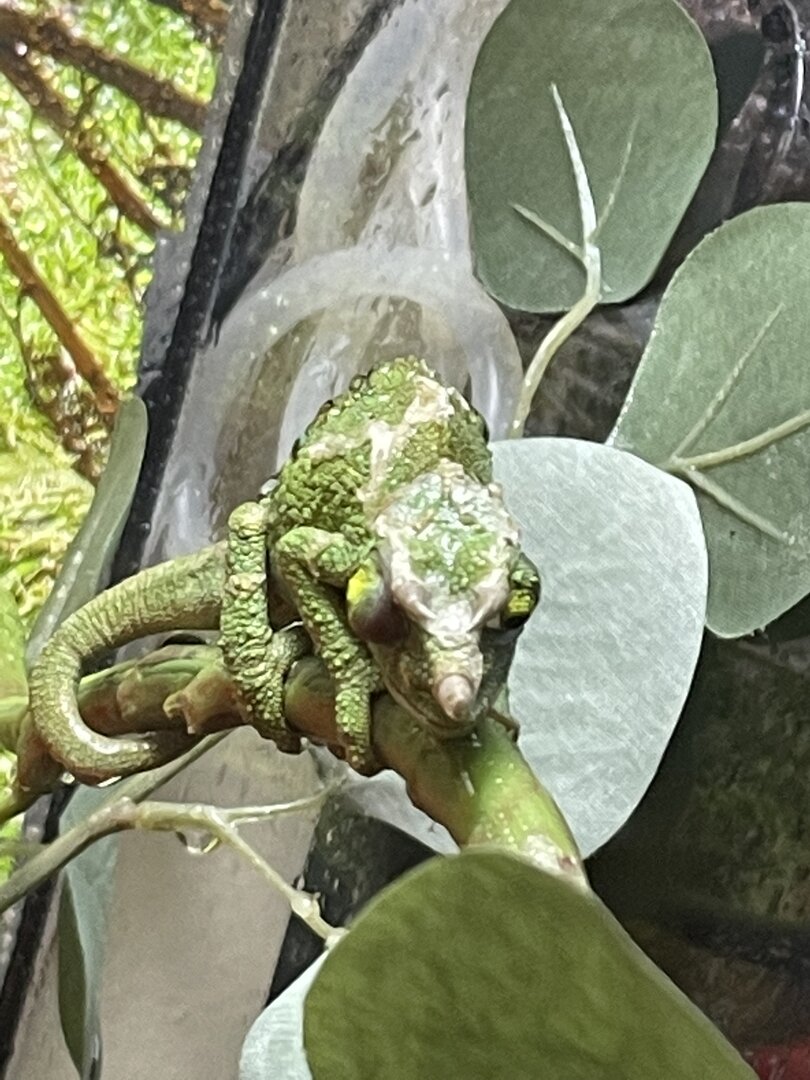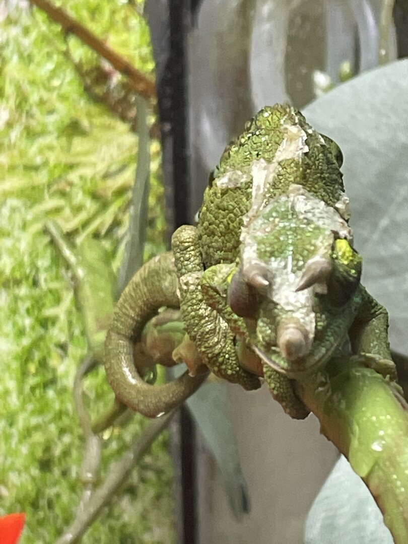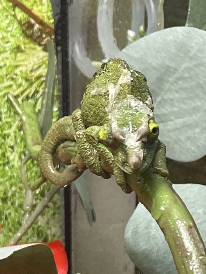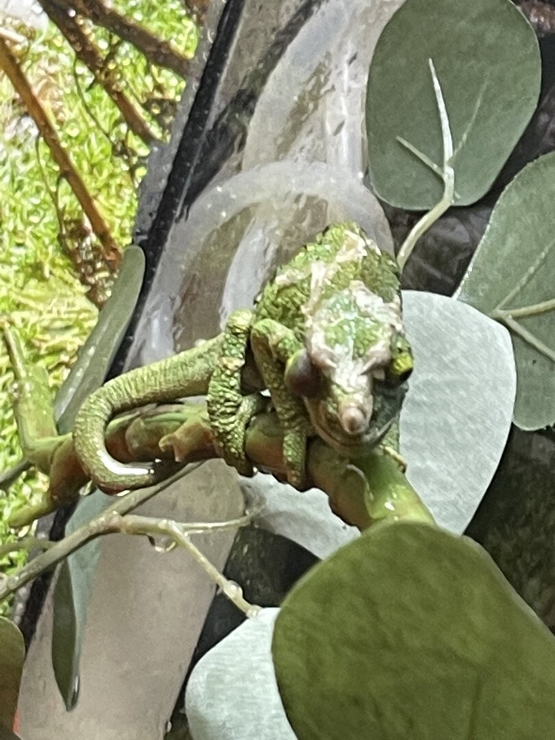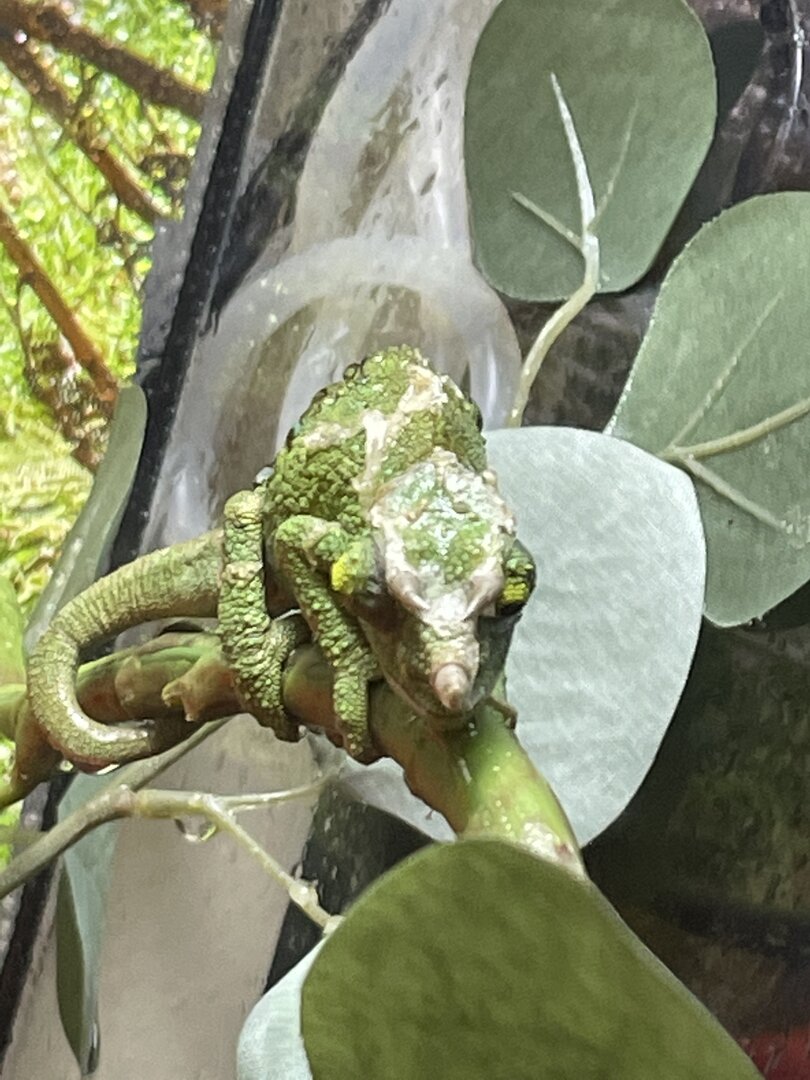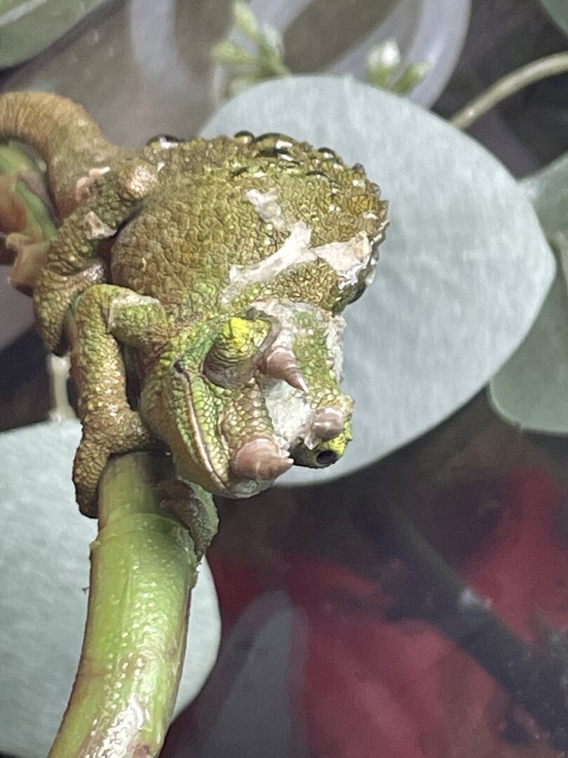 After the morning mist, my wife noticed Yoshi acting strangely wiping his eye on a branch, there was fluid coming out and it’s really swollen, but he has not moved from his branch all morning, there is no foreign object possibility, so I ask could he have gotten water into his eye area or something??