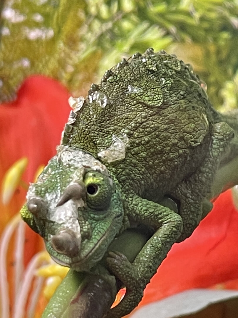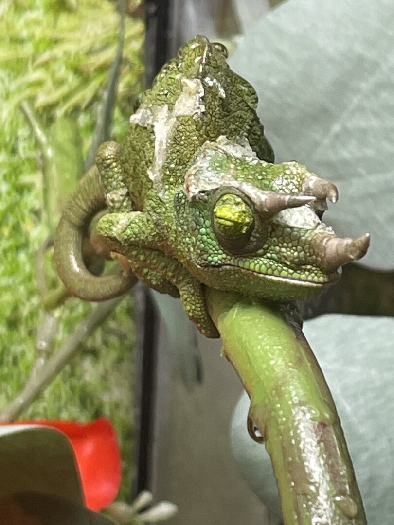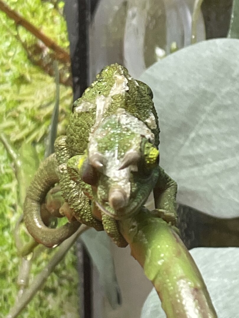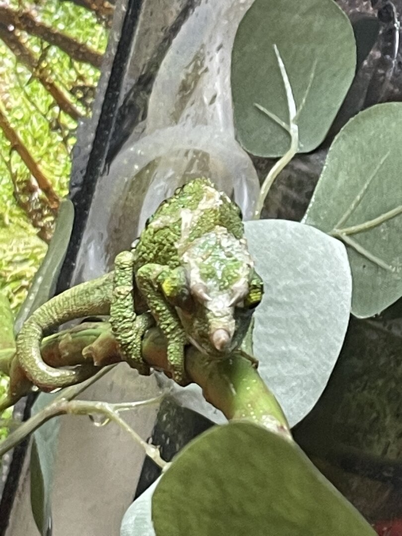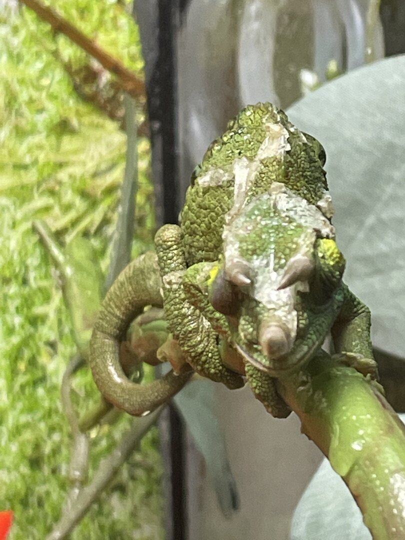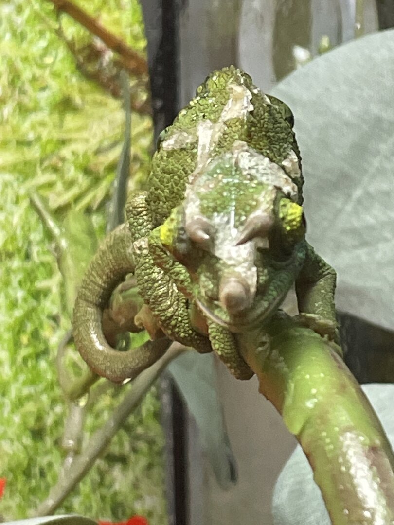 After the morning mist, my wife noticed Yoshi acting strangely wiping his eye on a branch, there was fluid coming out and it’s really swollen, but he has not moved from his branch all morning, there is no foreign object possibility, so I ask could he have gotten water into his eye area or something??