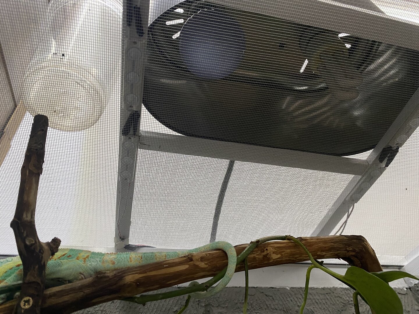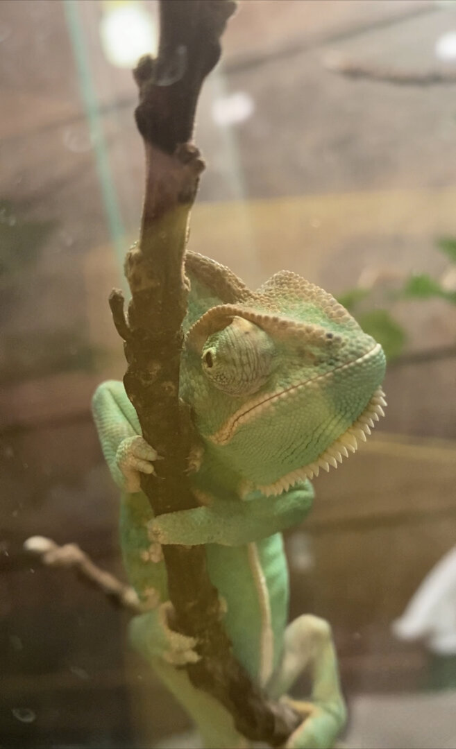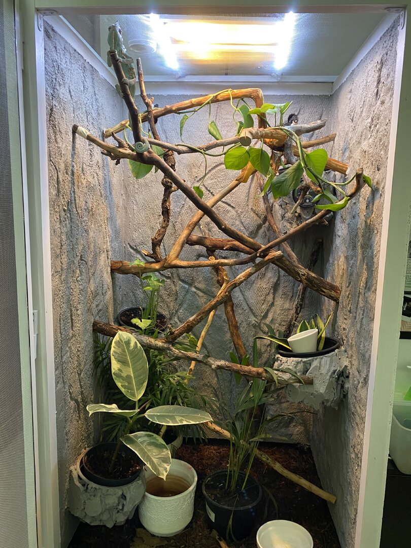Your chameleon may not be so big right now, but he will be soon and he definitely needs a much bigger enclosure. The standard minimum is 60x60x120 cm or equivalent. Unless you are somewhere very dry, I would suggest getting a screen or hybrid enclosure. It’s easy to block off the back or sides if needed with screen and still have excellent air flow. Then you need to create a tree inside. You can use something like a garden trellis secured to the enclosure frame to attach branches and vines to. Put in lots of branches and give him many little roads to travel on. You also need lots of live plants. Pothos is excellent for chameleons. Our veiled friends like to nibble on their plants and it only takes one bite of a fake leaf to cause a potentially fatal bowel obstruction.