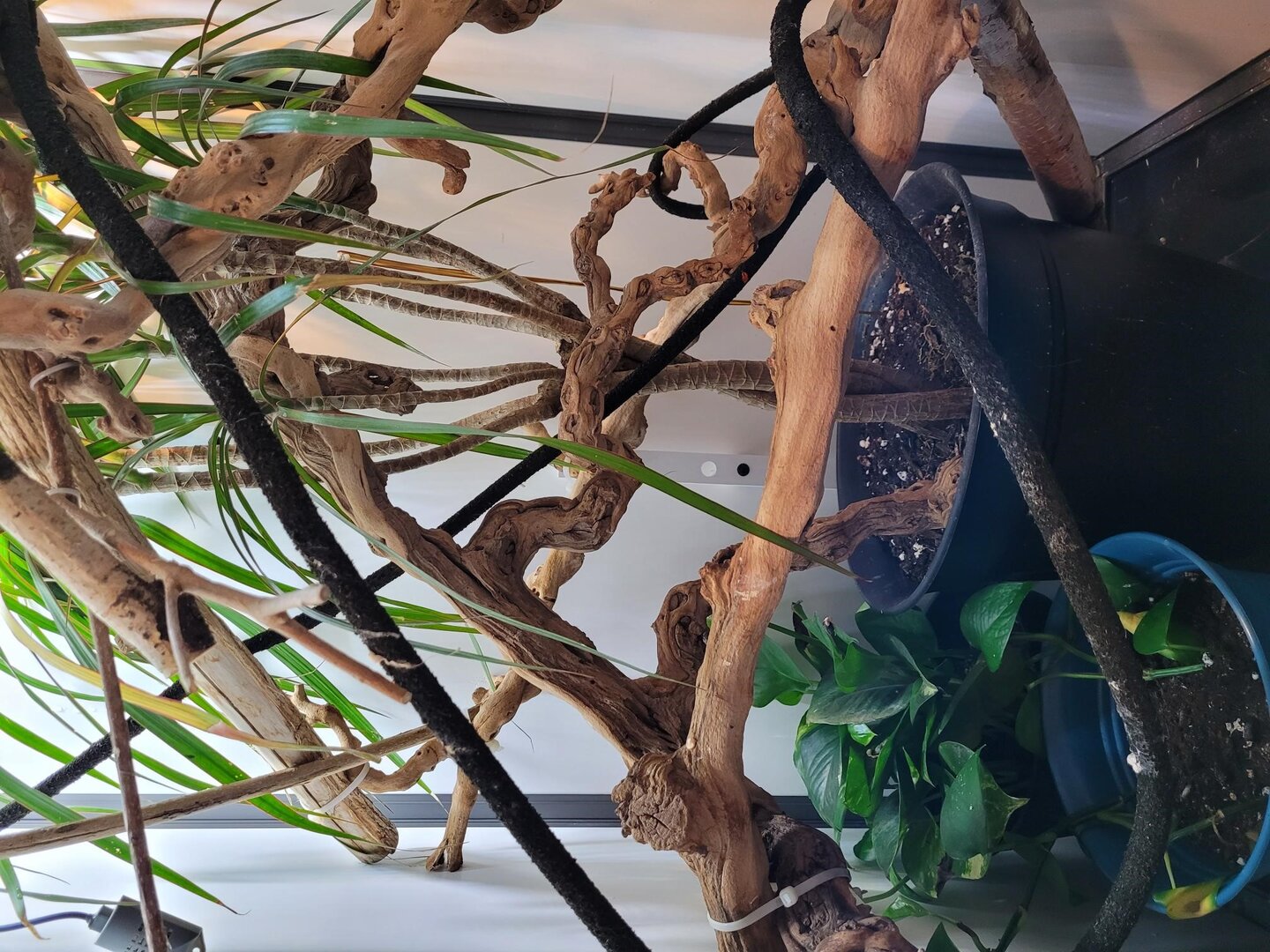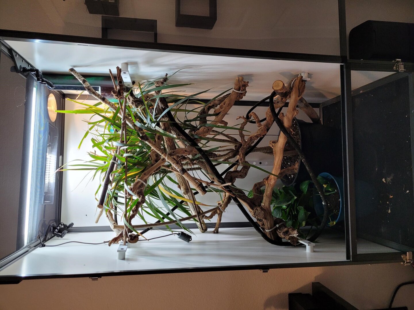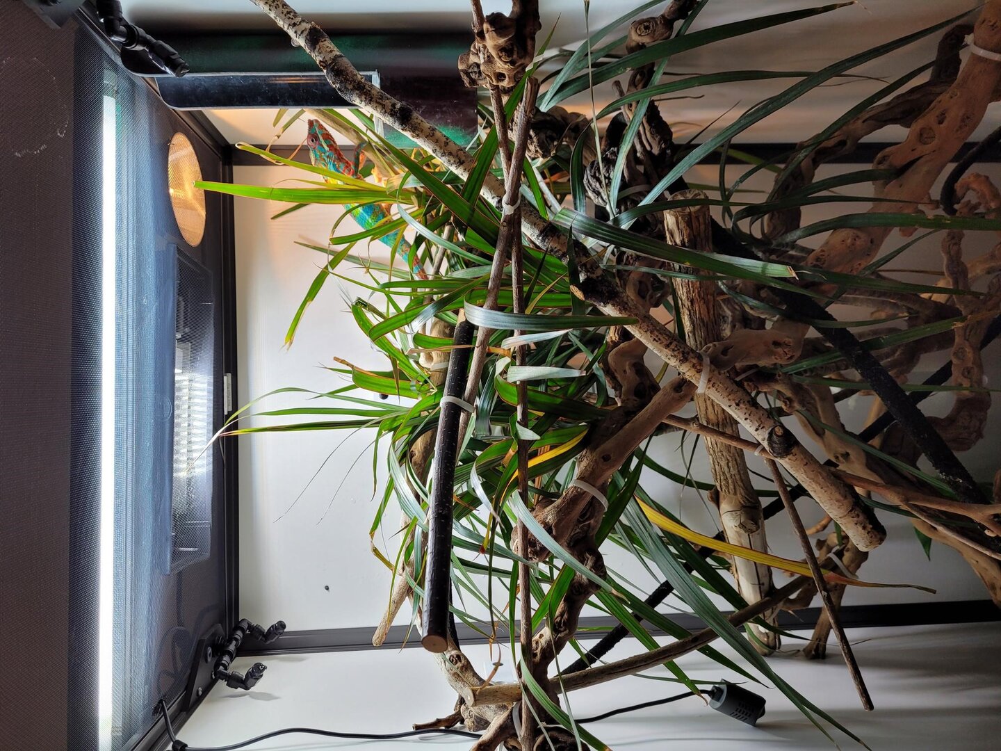 - Plants - Are you using live plants? If so, what kind? - We have live plants in the enclosure. At the bottom there are a couple of pothos plants and the main plant in his cage is a dragon tree (Dracaena marginata)