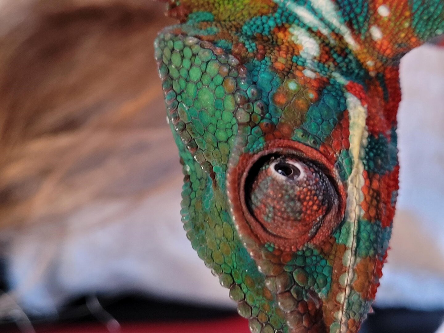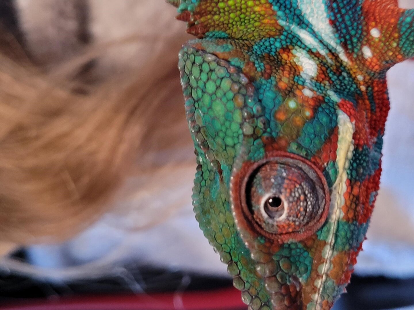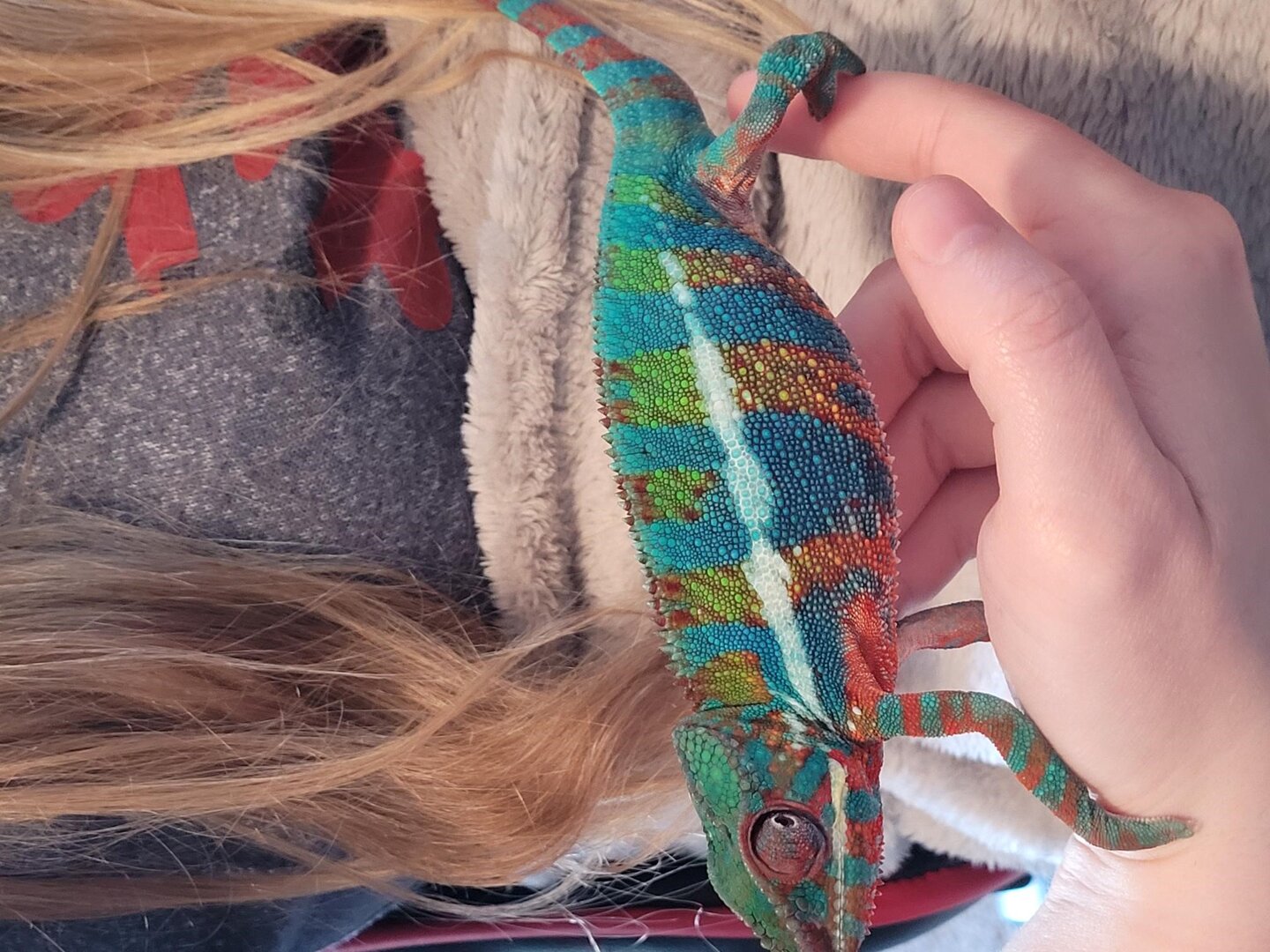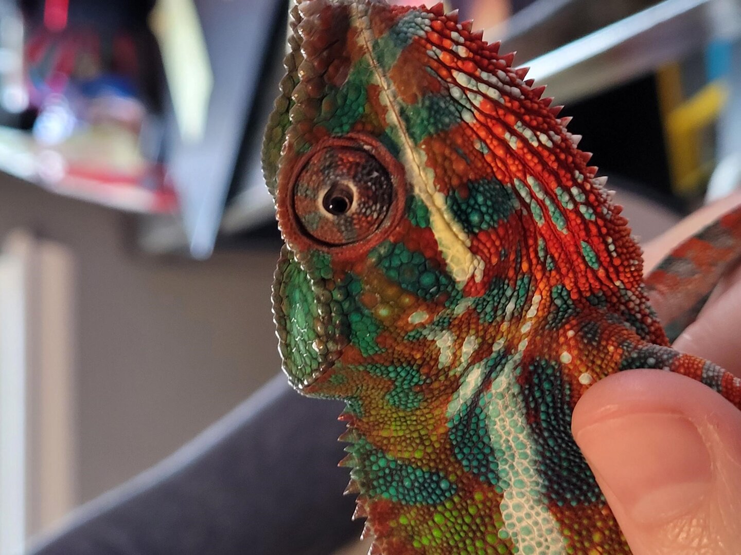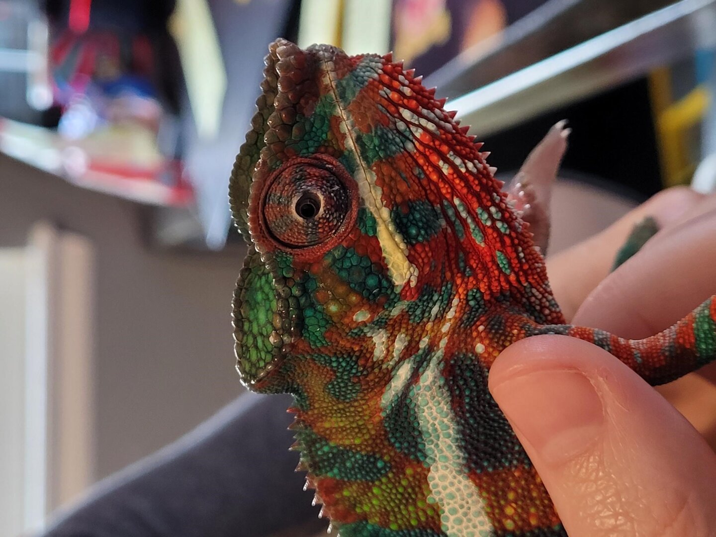 - Your Chameleon - The species, sex, and age of your chameleon. How long has it been in your care? - Panther Chameleon (locale cross from Kammerflage Kreations), Male, 9 months and 2 days old, He has been in our care since 11/24/20