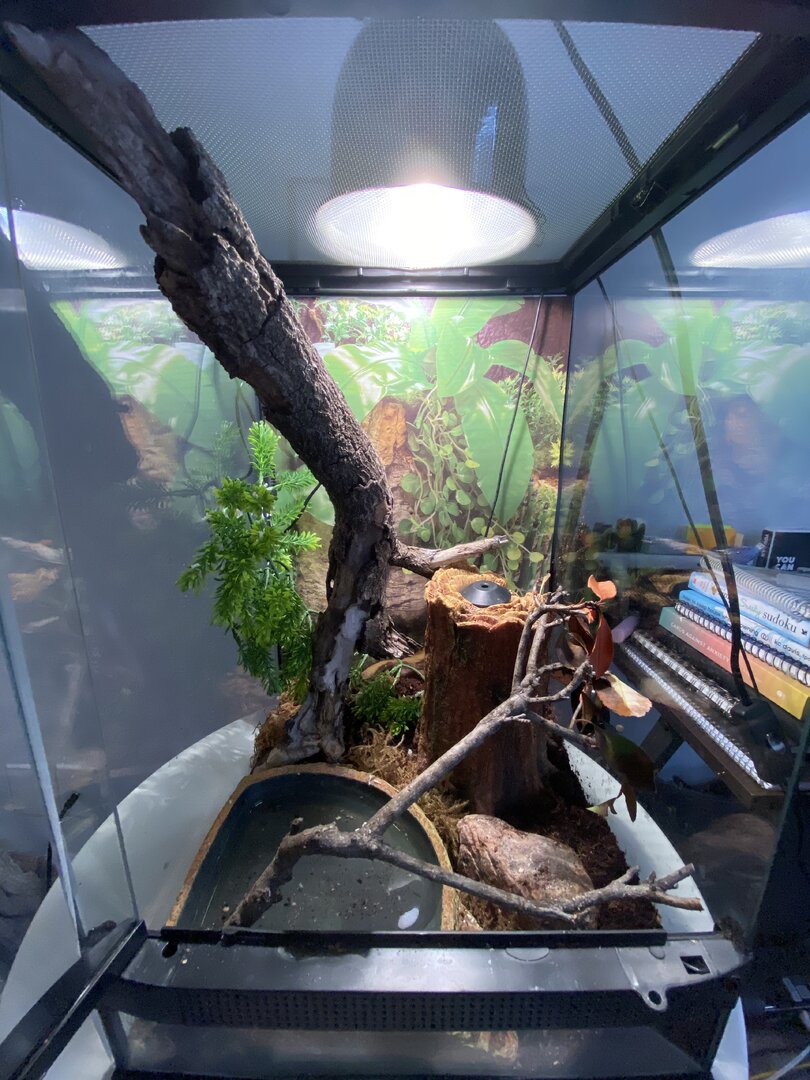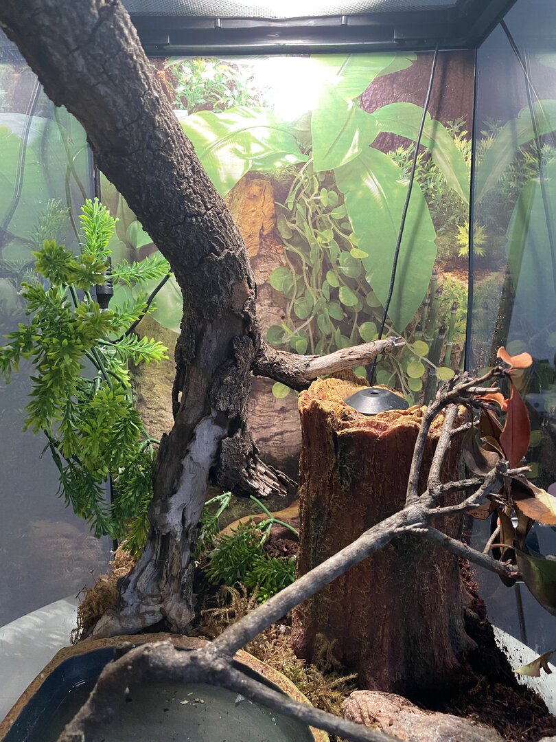 - Plants - Are you using live plants? If so, what kind? We have branches that we found outside- some with leaves on them but we weren’t sure if we should take the leaves off? Its from a bush near our apartment building. He doesn’t eat the leaves or is actually rarely near them unless hes moving around. We do know however that we are lacking in husbandry which is why im going out today to buy some plants as well!