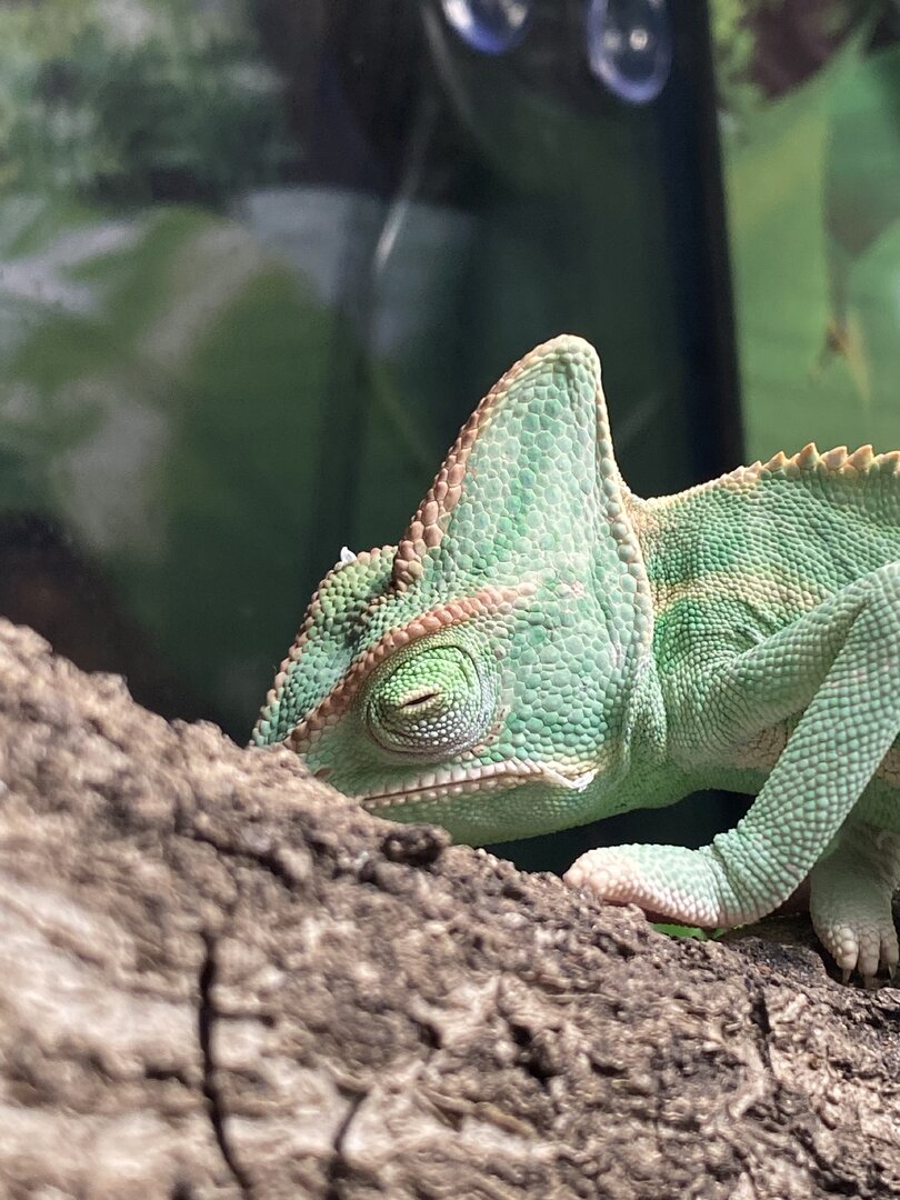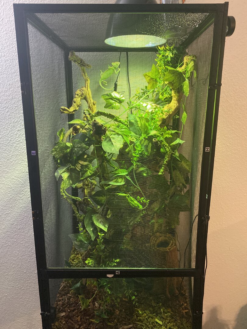- Watering - What kind of watering technique do you use? How often and how long to you mist? Do you see your chameleon drinking? We have a misting bottle that we use and we do it about 2-3 times a day- one in the morning and one once we get home but he also doesn’t seem to like it very much when we mist his cage and it gets in him so we dont really mist him directly. I’m not really sure how long we mist him for.. i would say about 20-30 seconds but we are scared to get too high of a humidity percentage. Ive seen him drink about twice but that was closer to when we first got him. We also do have a shallow watering bowl but after doing research we know that he doesn’t see it as drinking water but does sometimes walk through the water. I also plan on buying a dripper for him just because i do believe he’s dehydrated:/