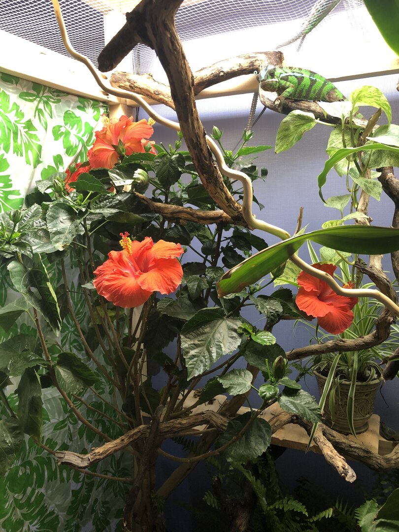 plants: hibiscus, Boston ferns, small croton, spider plant, queen pothos, snake plant, corn plant.
