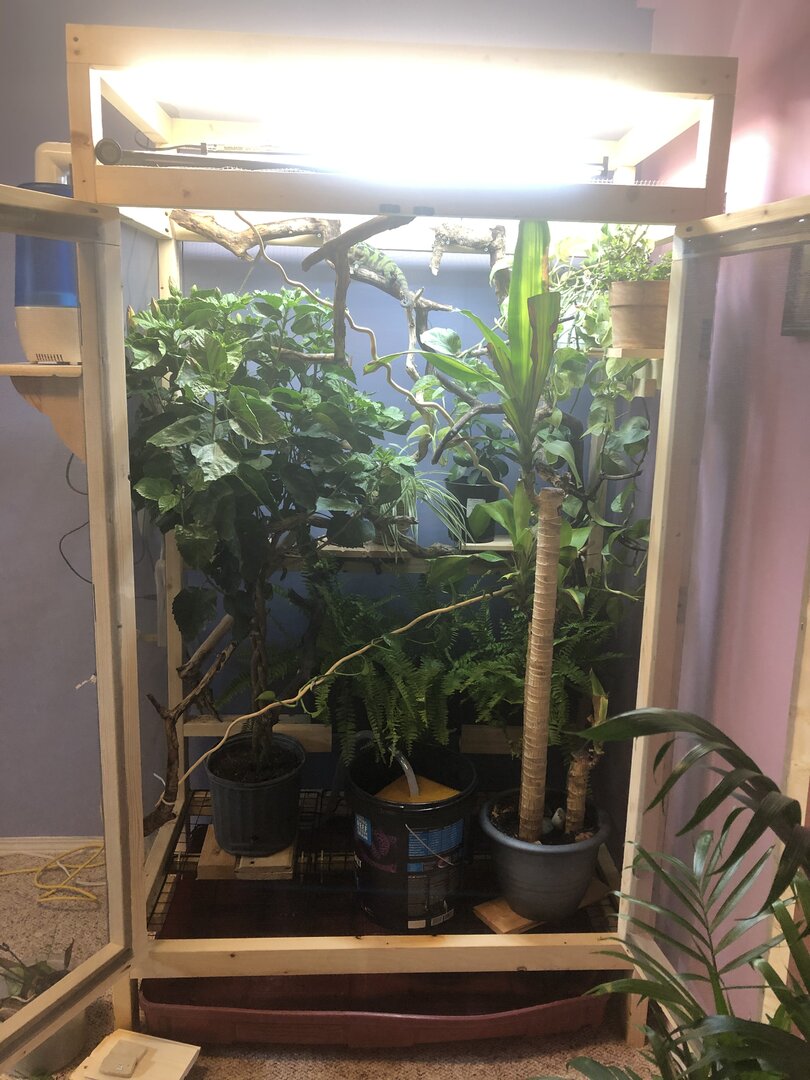 Cage is misted once a week for his ‘bath’ fogger runs at night only. With all the live plants the humidity is stable even without the fogger if misted once a week. I have seen him drink,