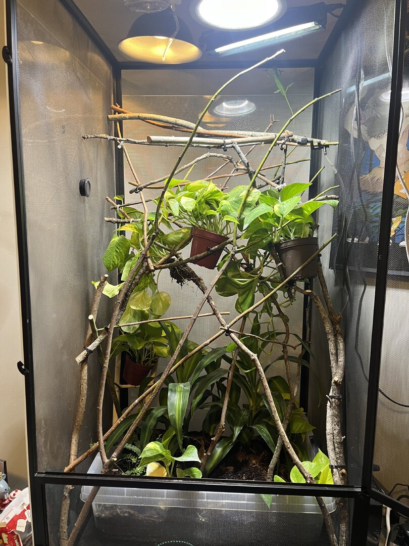 - Plants - Pothos throughout the cage, fern and draecena on bottom in bio substrate.