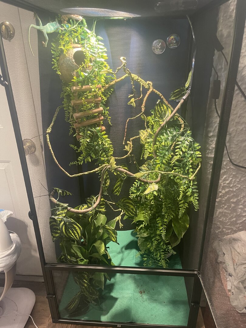 i had a plastic curtain around the cage to keep humidity in but the vet advised me to remove it for airflow. humidity is around 50 during the day and gets to 70 at night