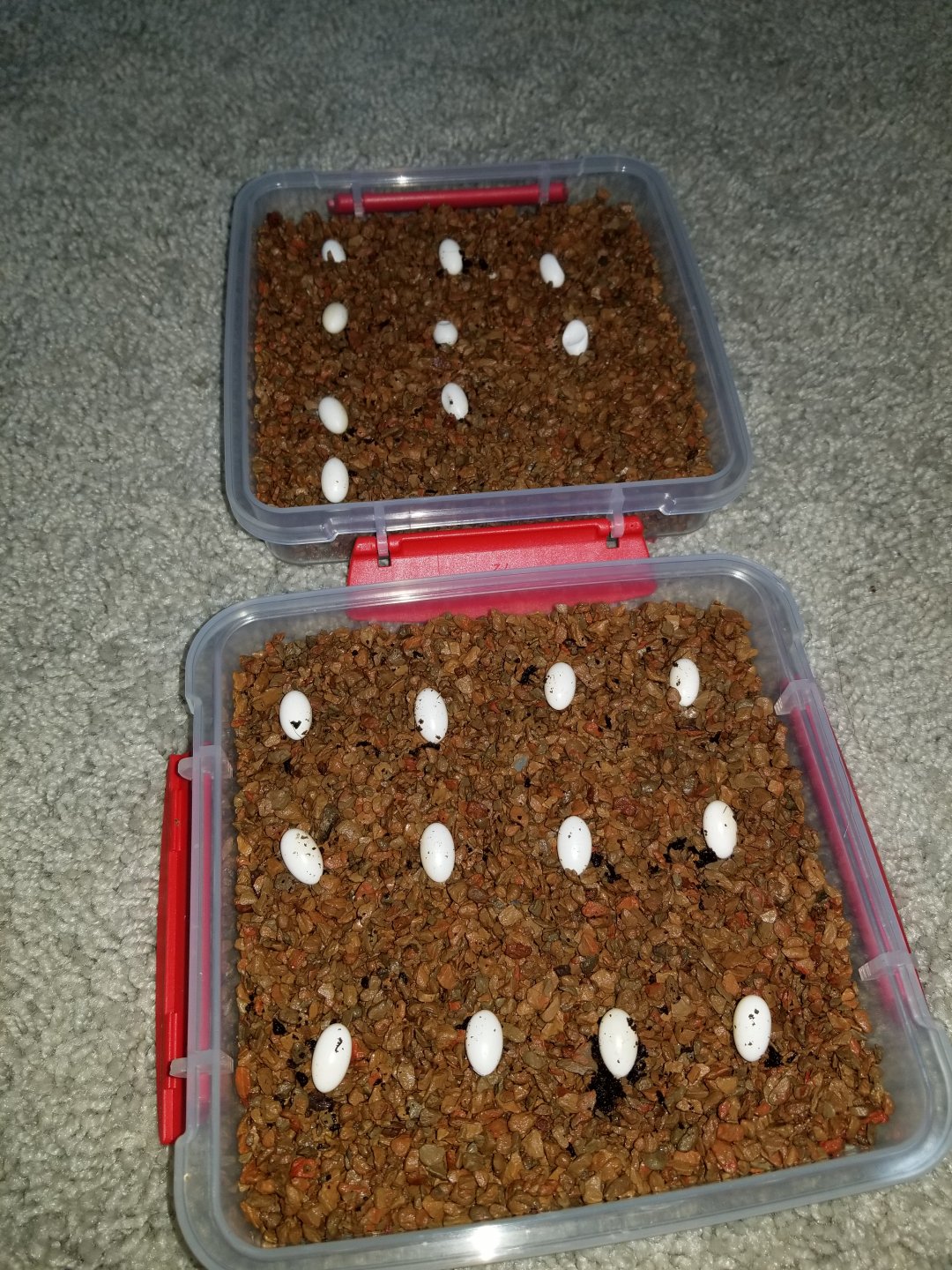 My female laid her second clutch of eggs today and they look much more healthier than her first clutch so im really hoping for a decent hatch rate with these eggs. She laid 19 her first time and 22 this time. Currently i have them in sealed deli containers and the substrate is repashy super hatch. I used this same substrate with her first clutch but after a month or so the eggs didnt look so good. Does anyone have experience incubating F lateralis eggs? If so what substrate did you use, what temps did you keep the eggs at, did you diapose the eggs and how long was the incubation period. There is a limited amount of information on breeding carpets. I have read articles from Frank Payne and have talked to Kevin briefly in the passed, i would just like some input from members who have experience breeding these guys. CB laterslis arent very commin so id really like to keep my carpets lineage going.