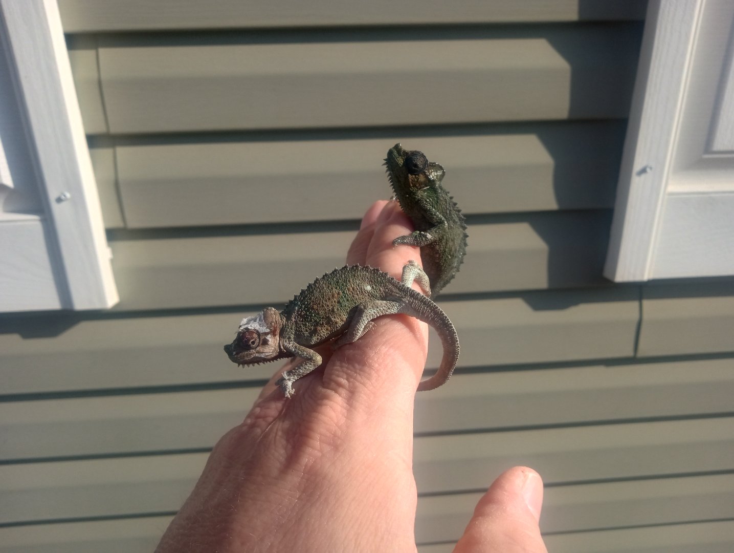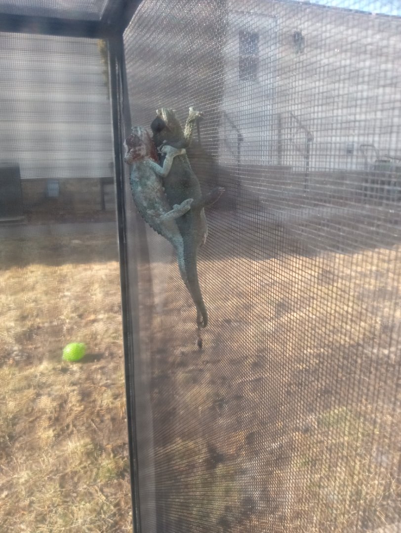 Male is mostly blue in coloration with bloodred eyes and throat and the female is a red headed. She looks green most of the time but can color up. Its in the 60's so they are dark in the pictures