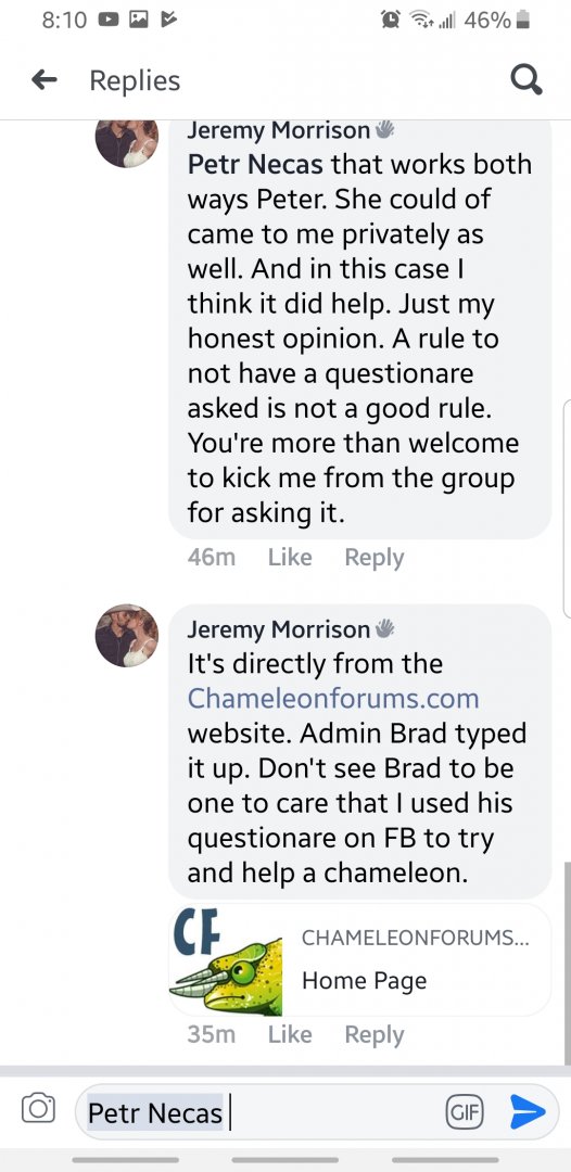 I went there to try and help there as well as seeing more chameleon pictures. Just super frustrating when you go to try and help someone and the Admin shuts you down for asking someone to fill out a questionnaire.
