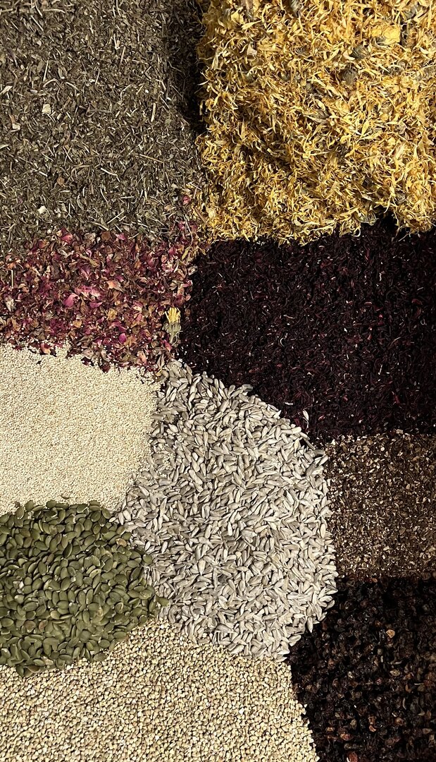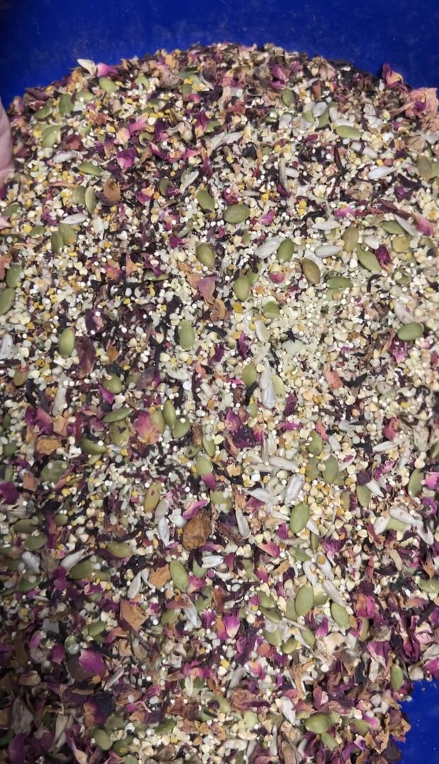 Ingredients:Alfalfa, Timothy hay, Orchard Grass, Soy beans, Dandelion Root, Dandelion leaves, Calendula Flowers, Sunflower seeds, Bee pollen, Hibiscus flowers, Rose flowers & leaves, Rose Hips, quinoa, Pumpkin seed, Buck Wheat, Rice bran, Brewers yeast, Spirulina.