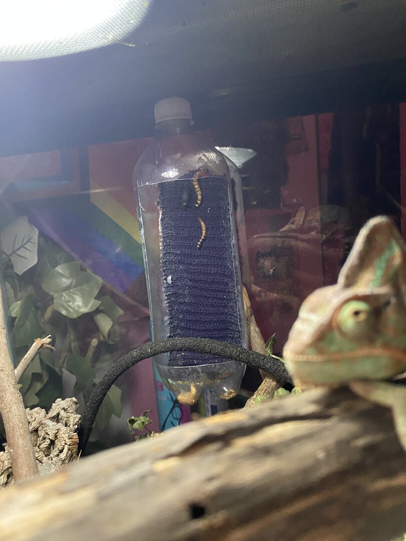 When Rango doesn’t eat from my tongs (he’s a bit sassy sometimes!), I tend to place his food in a running feeder I made. I followed a YouTube tutorial for it, making sure I used non-toxic glue and that I filed the edges of the plastic to avoid cuts.