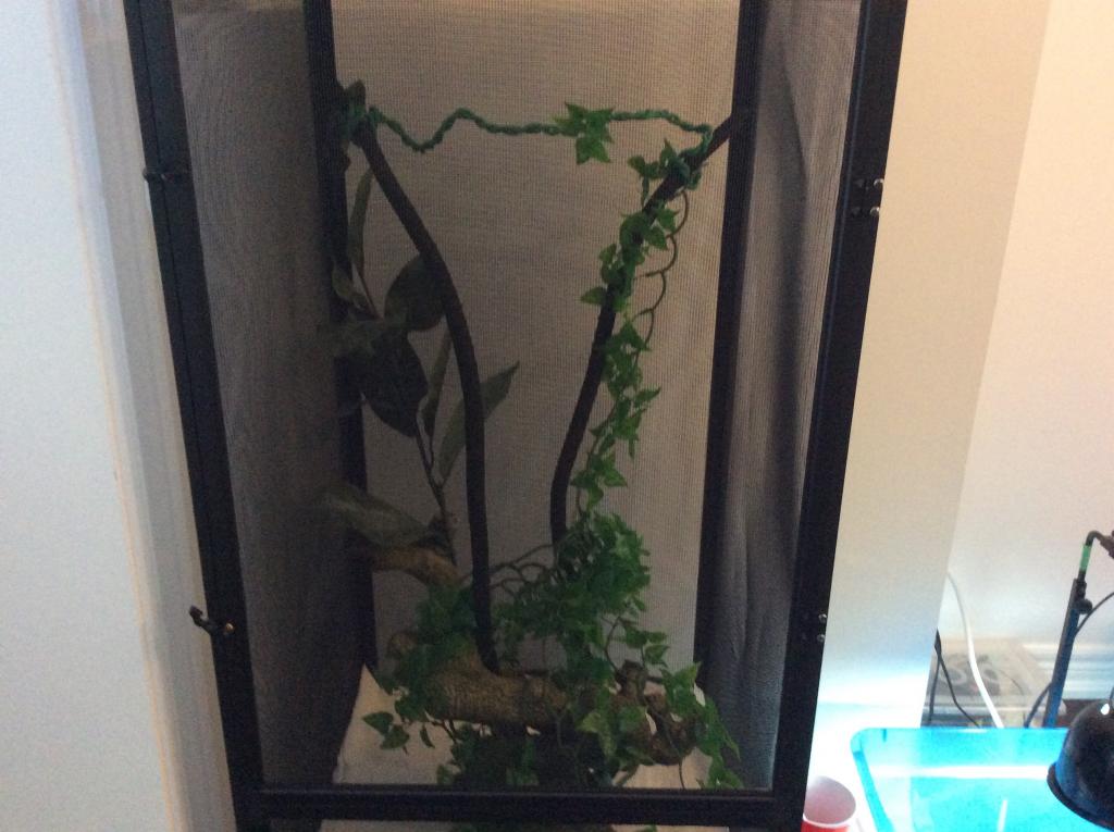 The screen cage you are keeping your cham in, I would agree with the others, looks very bare. I would say it needs much more foliage as well as more branches so your panther can actually climb around (More horizontal AND vertical branches) while feeling safe and secure. Otherwise he'll try to climb on the mesh of the cage, which I hear isn't good for their nails. Add a plant such as a schefflera, pothos, ficus, etc.-.
