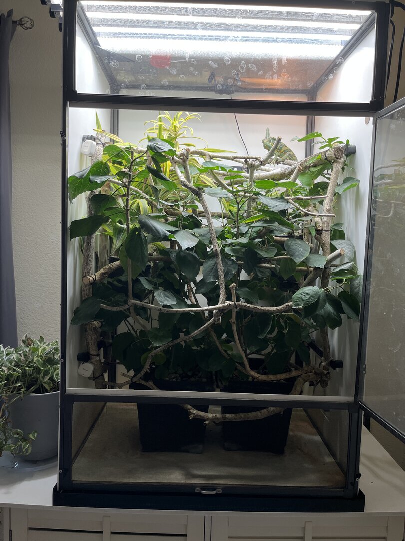 Details about his home... As I mentioned it is a Dragon Strand enclosure. This one is 30 inches wide 24inches deep and 48 inches tall. This one is no longer a cage that they make which is sad because it is by far my favorite size. I have a herpstat to control the basking temp which dims the fixture up and down. I am running a jungle dawn LED plant light and then 3 T5HO light fixtures. 1 of the T5HO fixtures is used for his 6% arcadia UVB bulb. Then I have 2 6500 daylight bulbs for plants in the other 2 t5ho fixtures. I have a mistking misting system and run 2 misting heads. He is currently getting 6-7 minute mistings 3 times a day. Once in the morning and two in the late afternoon and evening. This keeps my ambient humidity right in the sweet spot of 38-45% daytime which I need since I live in AZ where there is virtually no humidity and provides him with long misting sessions which he loves. I have 5 live plants in his enclosure. 2 hibiscus, 1 pothos, and 2 dracaena. All real branches were used for his enclosure. As I mentioned I modified his walls with PVC sheets to make his enclosure a hybrid. On the door panel I have 20 gauge marine vinyl and then the service door is screen to allow for the chimney air flow effect. I also run a small pc fan on top to help pull air up and out of the enclosure. I have a full throttle feeder cup as well for him. All of his lights are each on govee smart plugs so that the lights turn on slowly in the morning one after the other and then the same gradual lights off into the late afternoon and evening to start cooling down the cage. I also use 2 govee smart sensors so I know what my ambient temps and humidity are at all times. Govee devices are managed from an app on my phone which is super helpful.