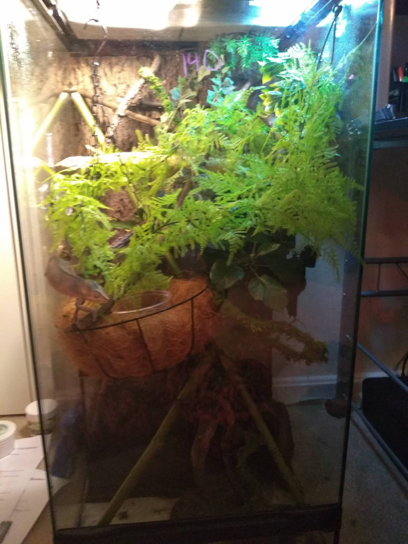40-50% during the day, 70-80% at night. Misting twice a day at minimum. Paper towel on bottom of cage. Added a coco liner plant hanger, currently growing a fern for it. Hibiscus plant