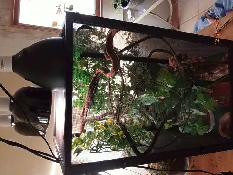 - Lighting - Zoo Med 5.0 UVB reptisun 13w and zoo med 60w daylight blue with UVA but had to replace with Exo terra 60w daytime without UVA also a ceramic heat emitter 60w for winter here.