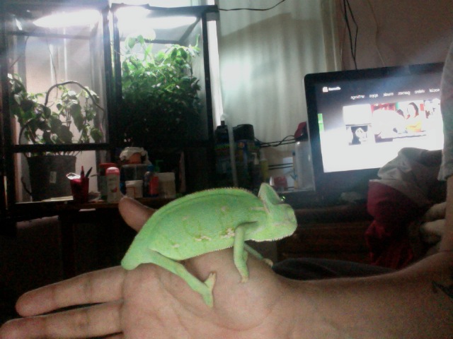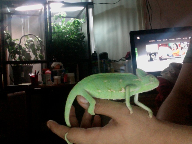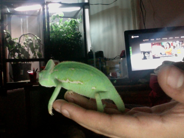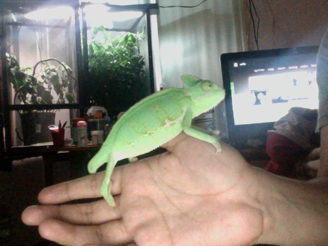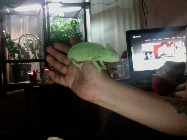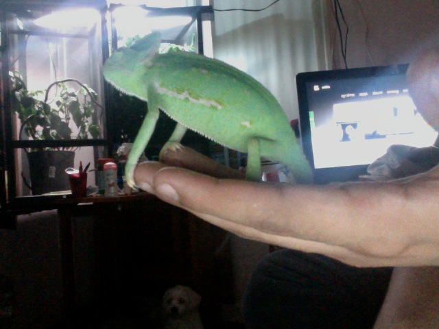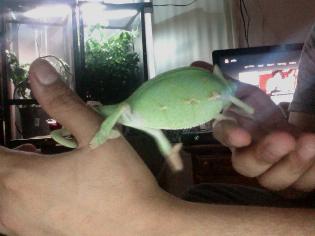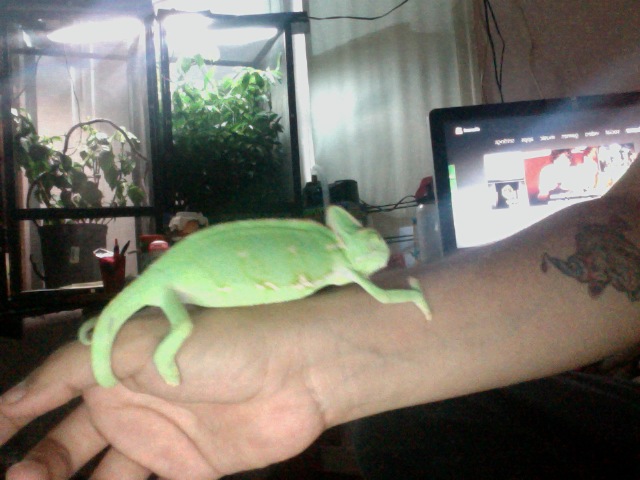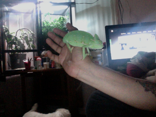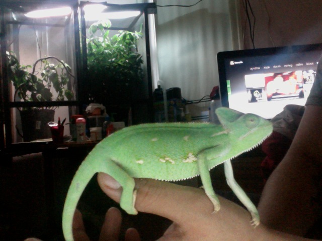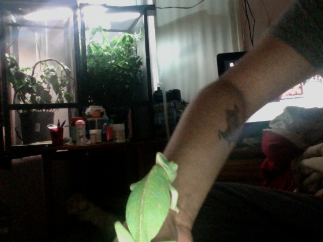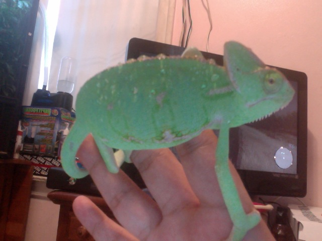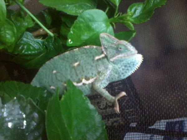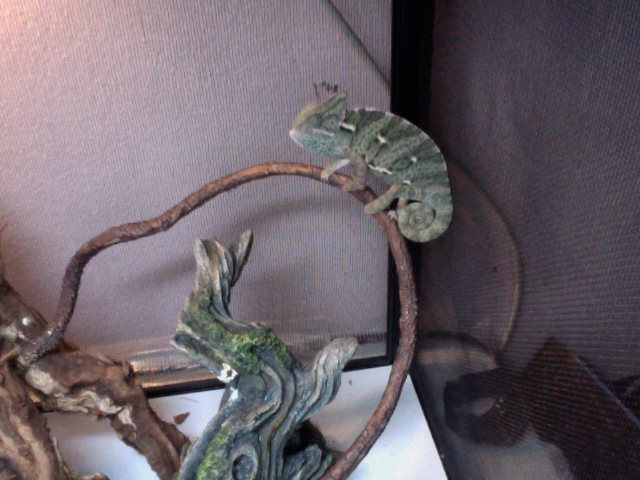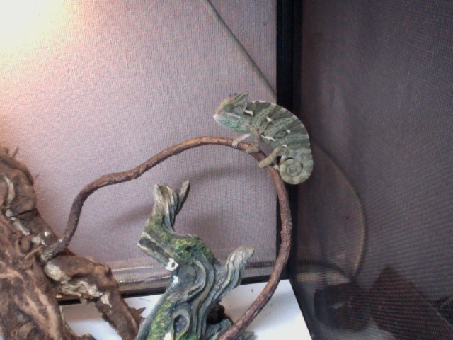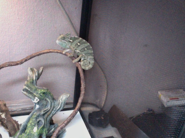 picture number 2 is her showing her native colors & 5 where old pictures of her cage ( wich by the way she eat the whole tree ) the rest are the most recent one