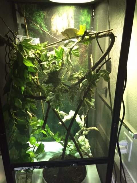 Plants - Live Pothos and fake foliage (I have a small container, 12" around and maybe 6" deep for her to scratch around if she becomes gravid, I don't think she is yet. I'll move her to a large container if she becomes gravid)