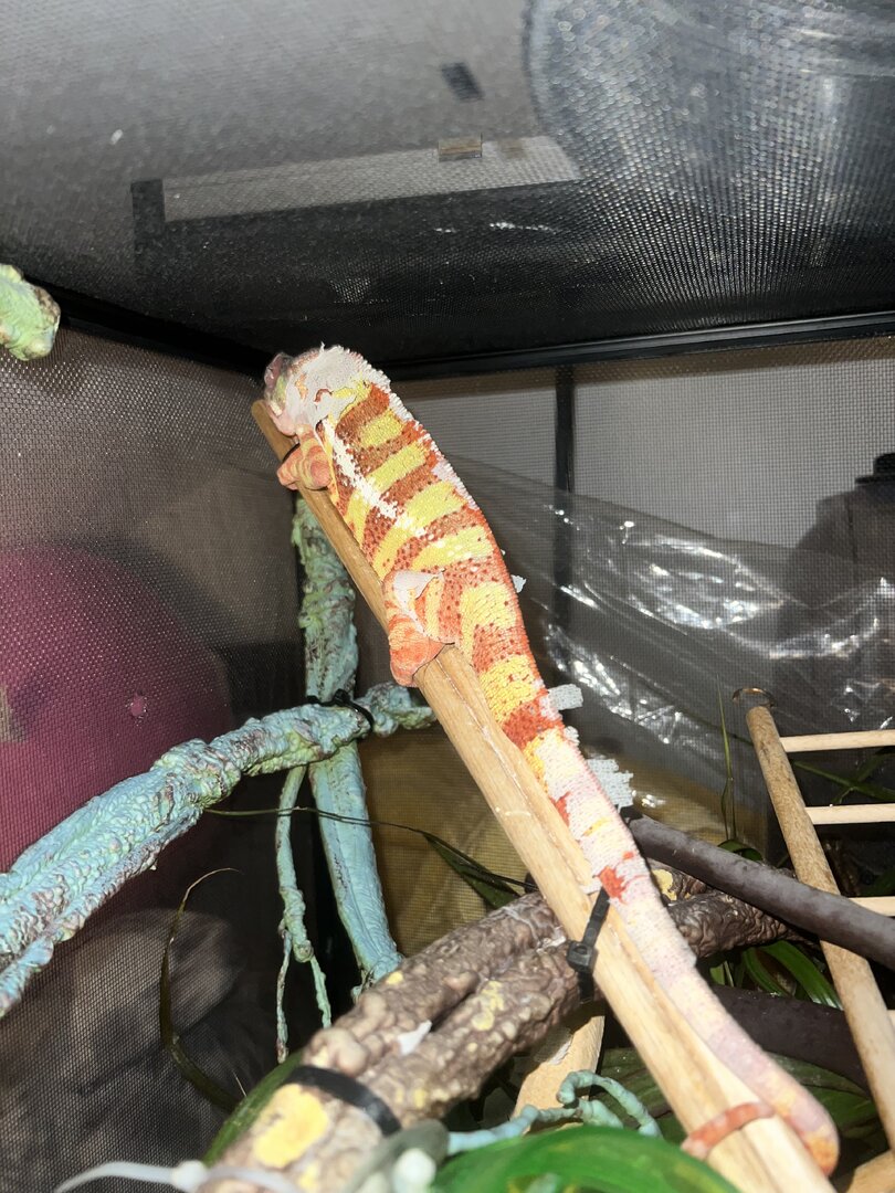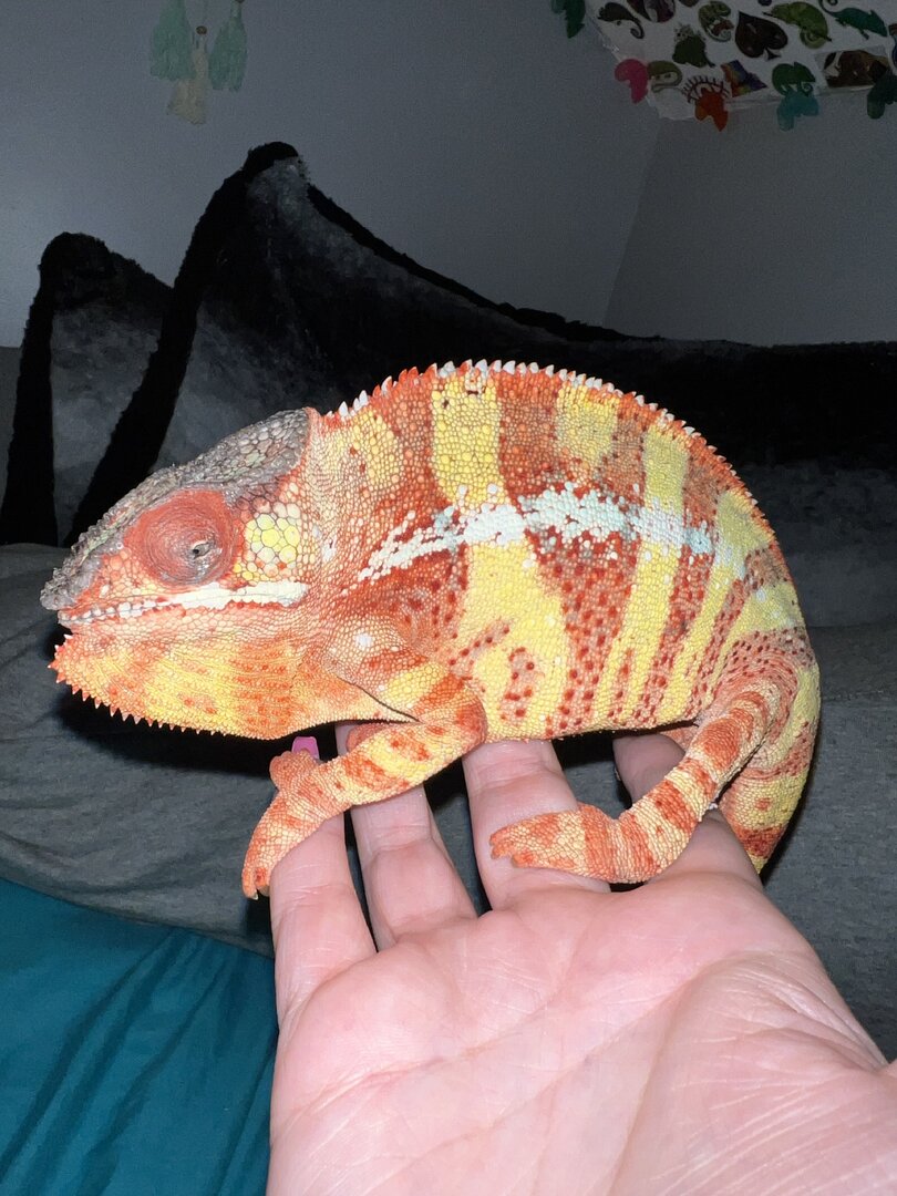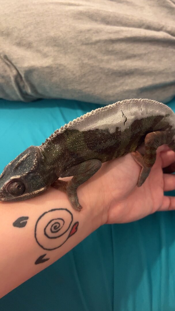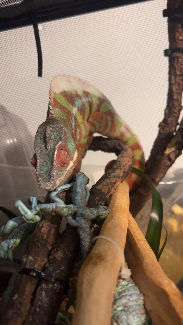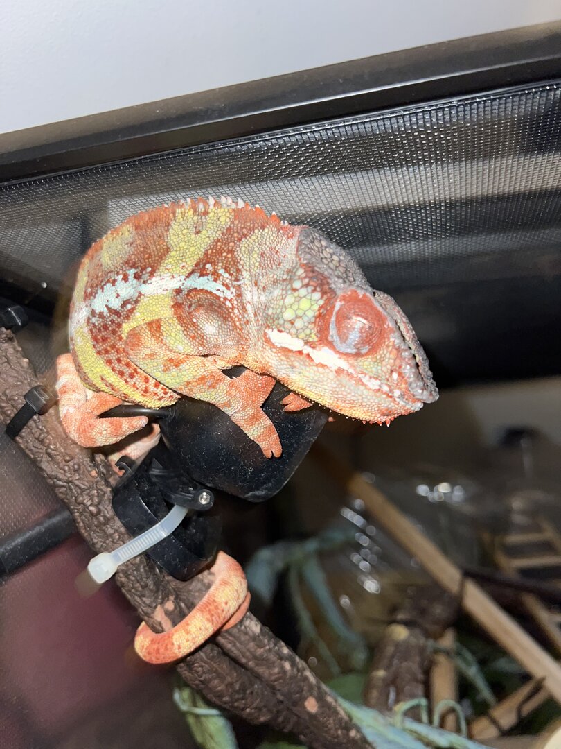 Hi! I have a 4 year old male panther chameleon who has had health issues since I got him. He first had an issue with his eye that has resolved but recently he has had lots of feeding issues and has been loosing a lot of weight. After 2 vet visits of finding nothing wrong I asked them if there were any tests they could run to look inside. They did an xray, ultrasound and bloodwork and found that he has a lot of gas inside of his body. They said this happens from a hole in the gastric system or respiratory system. They are pretty sure it is from the respiratory system. I dont really have any good pictures but I can try and take some of him to show how round he looks. He has looked like this since I got him. (I got him Febuary of 23) For the past week he has been very unactive and has stopped eating again! The eating wasn't my main concern, it was the lack of activity. I made an appointment as soon as I could and here we are. They gave me antibiotics but dont seem too certain that he will make a recovery. I am not an expert and will not say that he wont recover or will because I have never heard of this happening! Does anyone know anything about this? Is there a chance for his recovery? Should I try to find a different vet to get another opinion on this? I dont want him to be in pain or suffer but I dont want to just give up and put him to sleep. I am trying to force feed formula but hes so strong and Im nervous I will hurt him trying to open his mouth. Any advice on that too? I attached a few photos of him to try and show his roundness but it just looks worse in person.