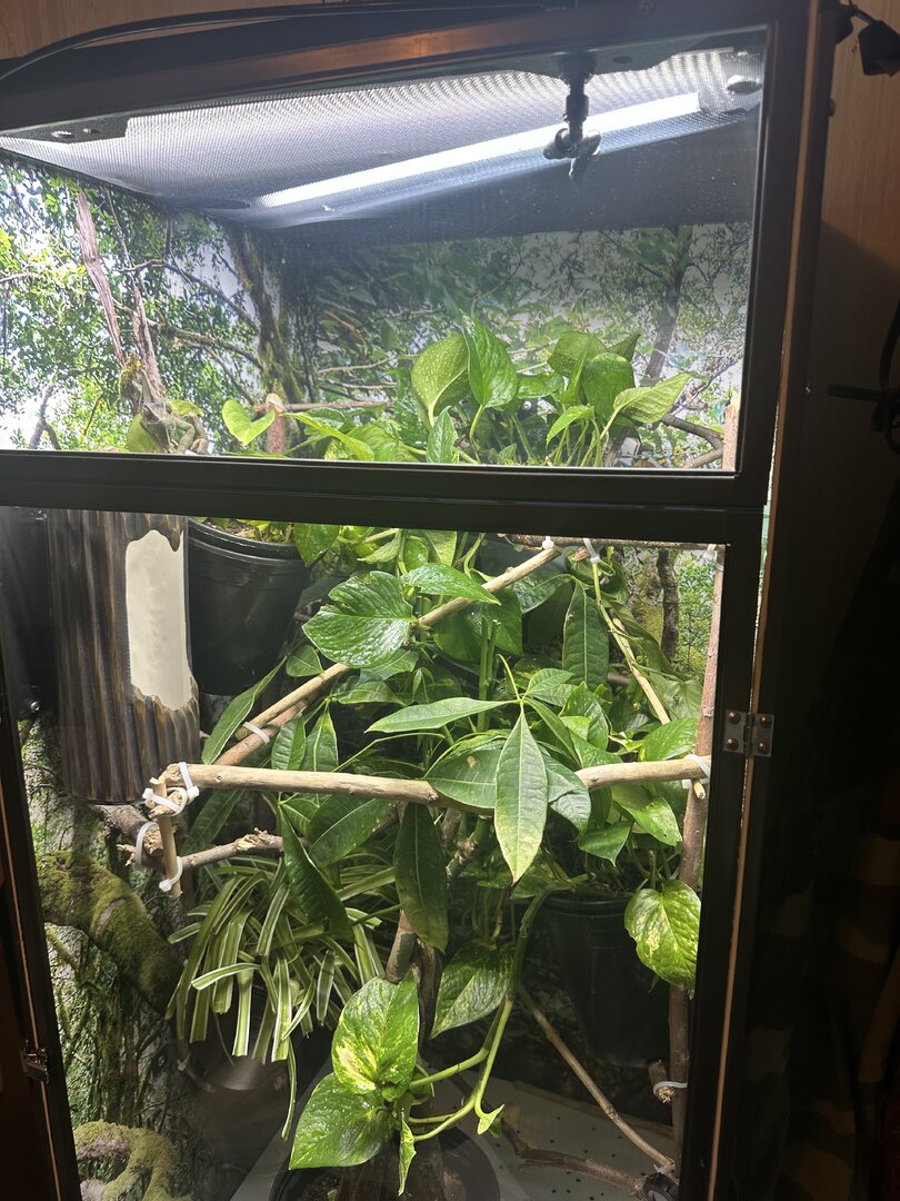 Update with Mr. Chameleonaire, after a few weeks my bsfl finally turned into the flies and he absolutely frickin loves them lol. He’s been eating like a champ and I’m finally getting him used to Dubia roaches. I now have a consistent mix of bugs - crickets, bsfl/and flies now, and dubia roaches but I need to get a treat bug. I added another pothos to create more of the forest edge. I still want to fill in the middle upper right area with a prayer plant or something. Anyone know when the photo contest winners will be announced?