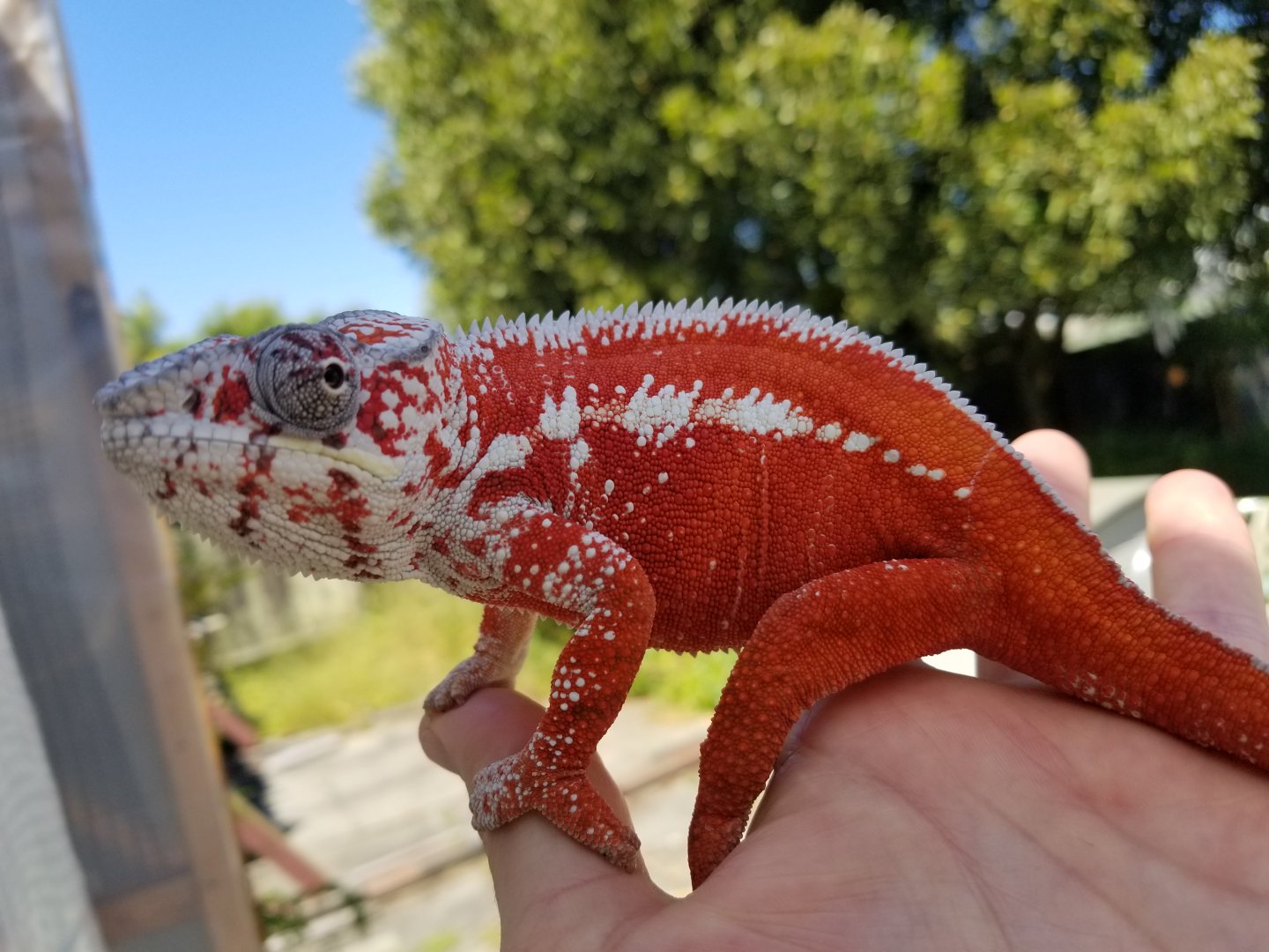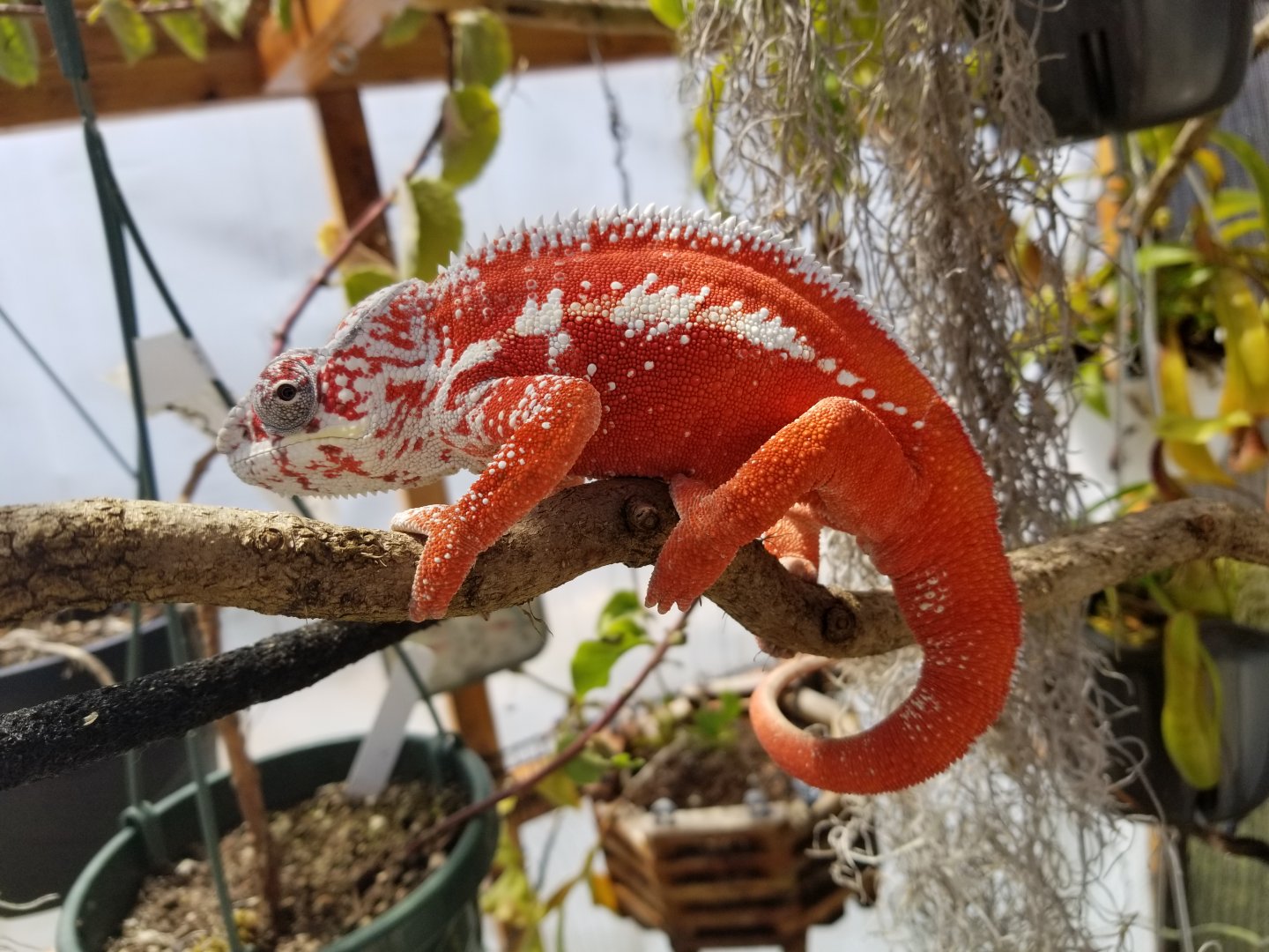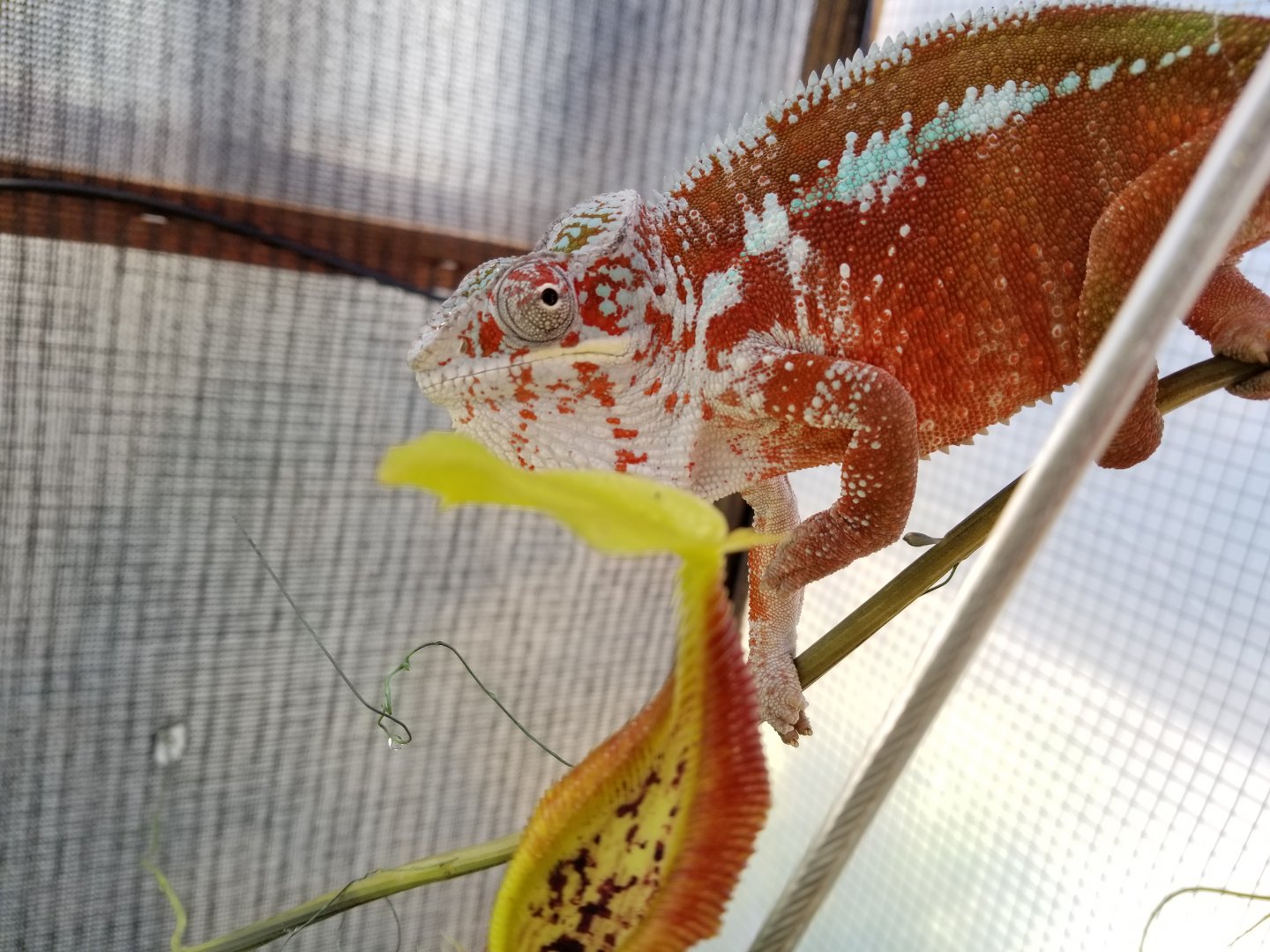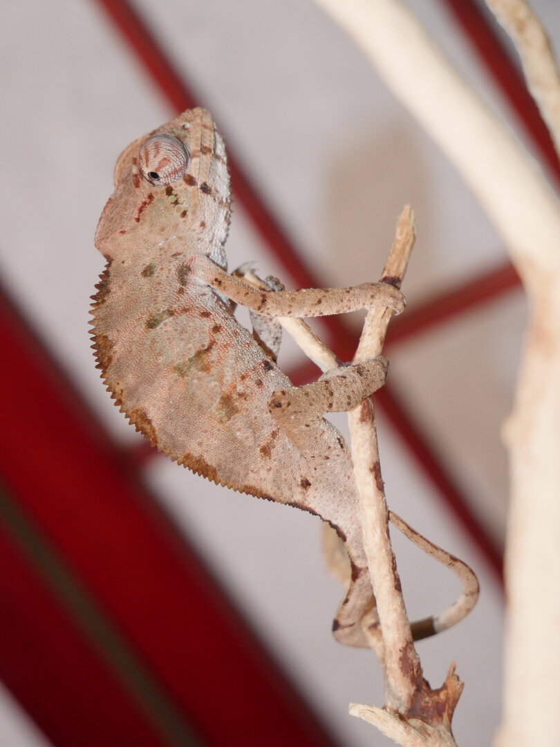 Sorry I don't have ANY pictures of Esmerelda's parents, I got them for a hobbyist that didn't understand chameleon care, they said they bought her from FL Chams (So she should be from the Clayton line). They would have killed her eventually if they had her much longer than the 3 months they did. So she's kinda a rescue in a way.